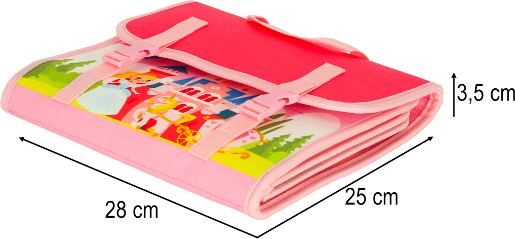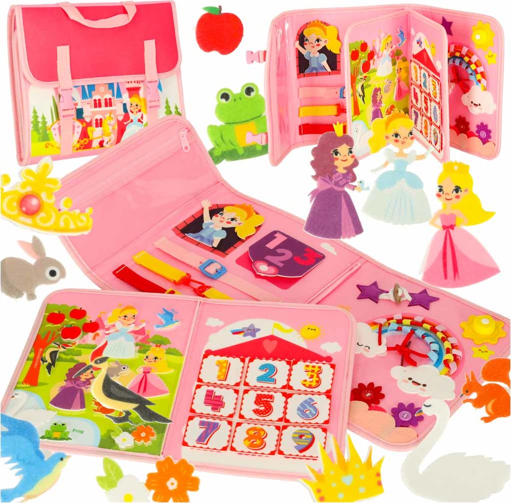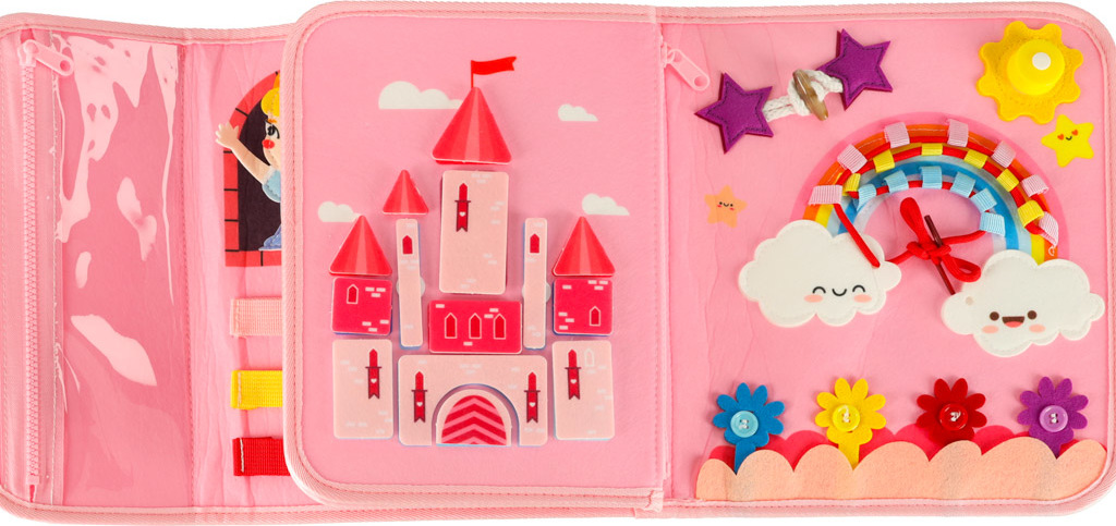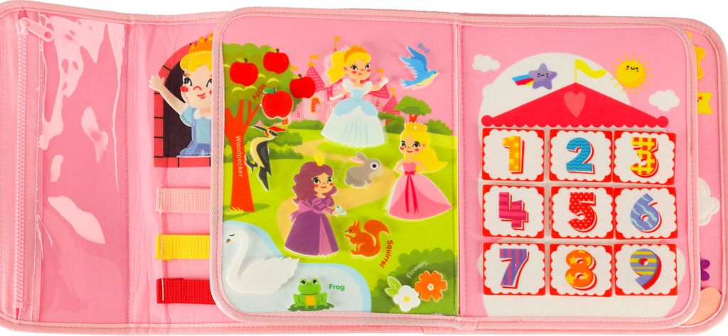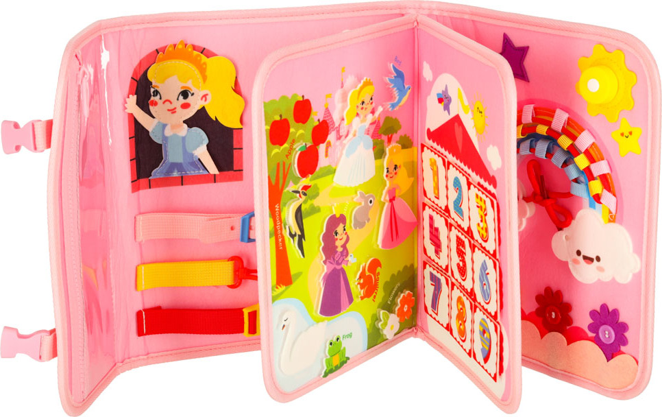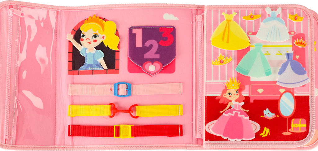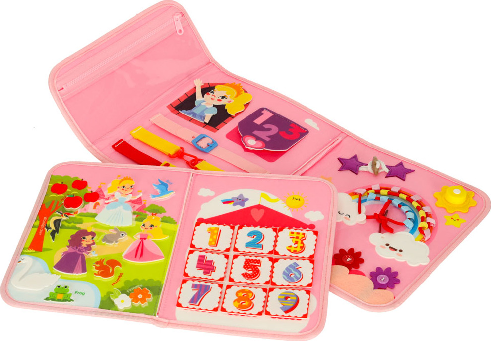Manipulační deska princezny je multifunkční vzdělávací hračka. Umožní vašemu dítěti učit se a upevňovat čísla, tvary nebo barvy. Dílky puzzle v angličtině budou pro vaše dítě užitečné při učení slovní zásoby. Jednotlivé dílky desky umožňují procvičovat drobnou motoriku a manuální zručnost. K dispozici jsou různé typy zapínání - tkaničky, zipy a patentky. Pomocí úkolů na tabuli dítě rychleji zvládne samostatné zavazování bot nebo zapínání bundy. Retro tvar batohu s popruhy umožní používat tabuli i mimo domov.