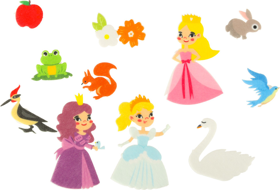 - Samolepky: žába, labuť, princezny, květiny, veverka, pták, zajíc, datel