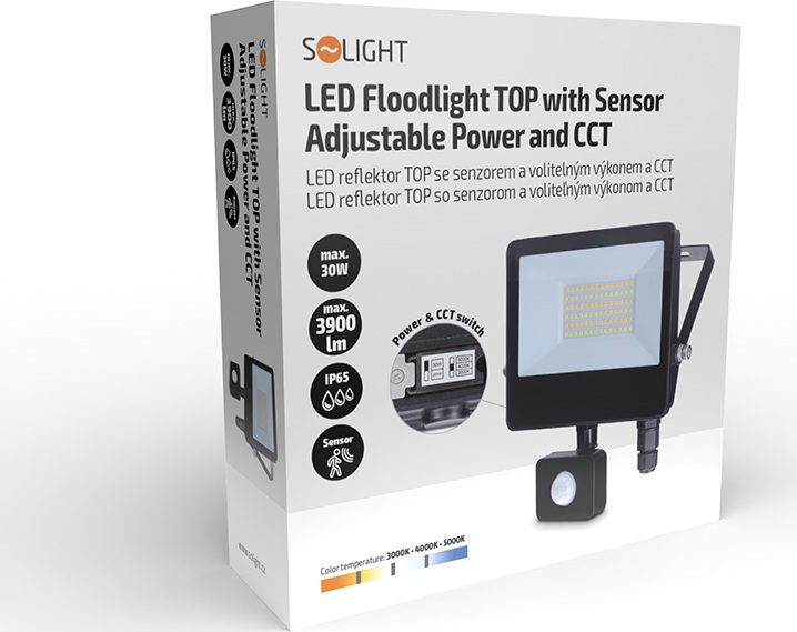 Solight LED reflektor se senzorem TOP, 30W, max. 3900lm, 3CCT, volitený výkon 100/66%, IP65, rychlospojka