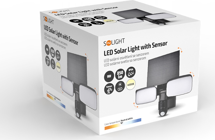 Solight LED solární osvětlení se senzorem, 9W, 850lm, 4000K, Li-Ion, černá