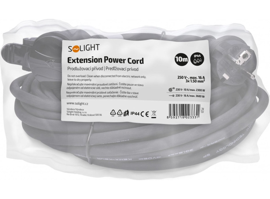 Solight prodlužovací přívod - spojka, 1 zásuvka, 10m, 3 x 1,5mm2, gumová, černá