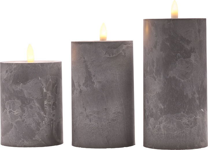 Vytvořte si elegantní atmosféru s LED svíčkami s efektem přirozeně blikajícího plamene a luxusním dekorem šedého mramoru. Tato sada tří svíček vnese do vašeho interiéru moderní a útulný vzhled bez nebezpečí otevřeného ohně.