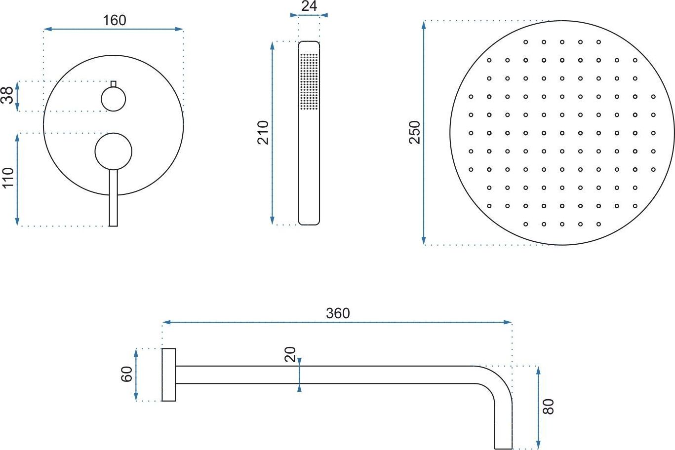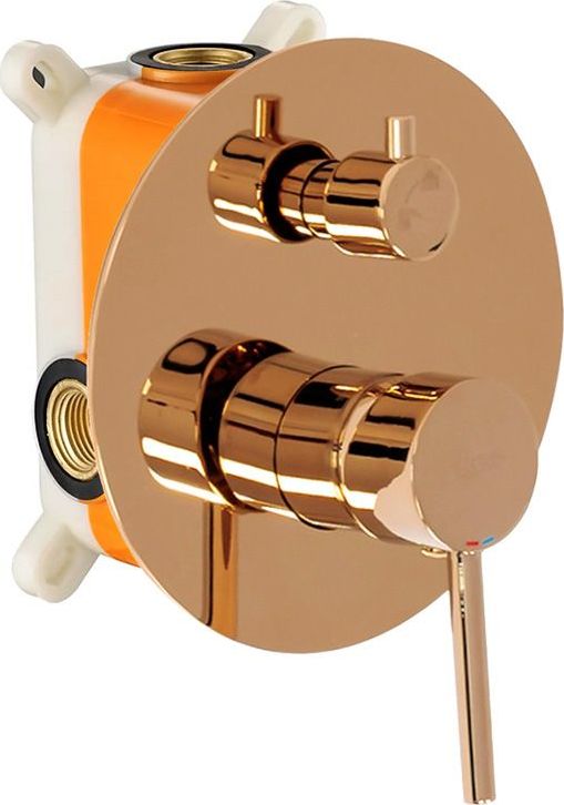 Moderní podomítková souprava v měděném broušeném provedení se skládá z baterie s mosaznou podomítkovou konstrukcí s krycí deskou vyrobenou z nerezové oceli, horní sprchové hlavice z plastu, vývodu s držákem ruční sprchy z mosazi, opletené 150cm hadicí na ruční sprchy z plastu.