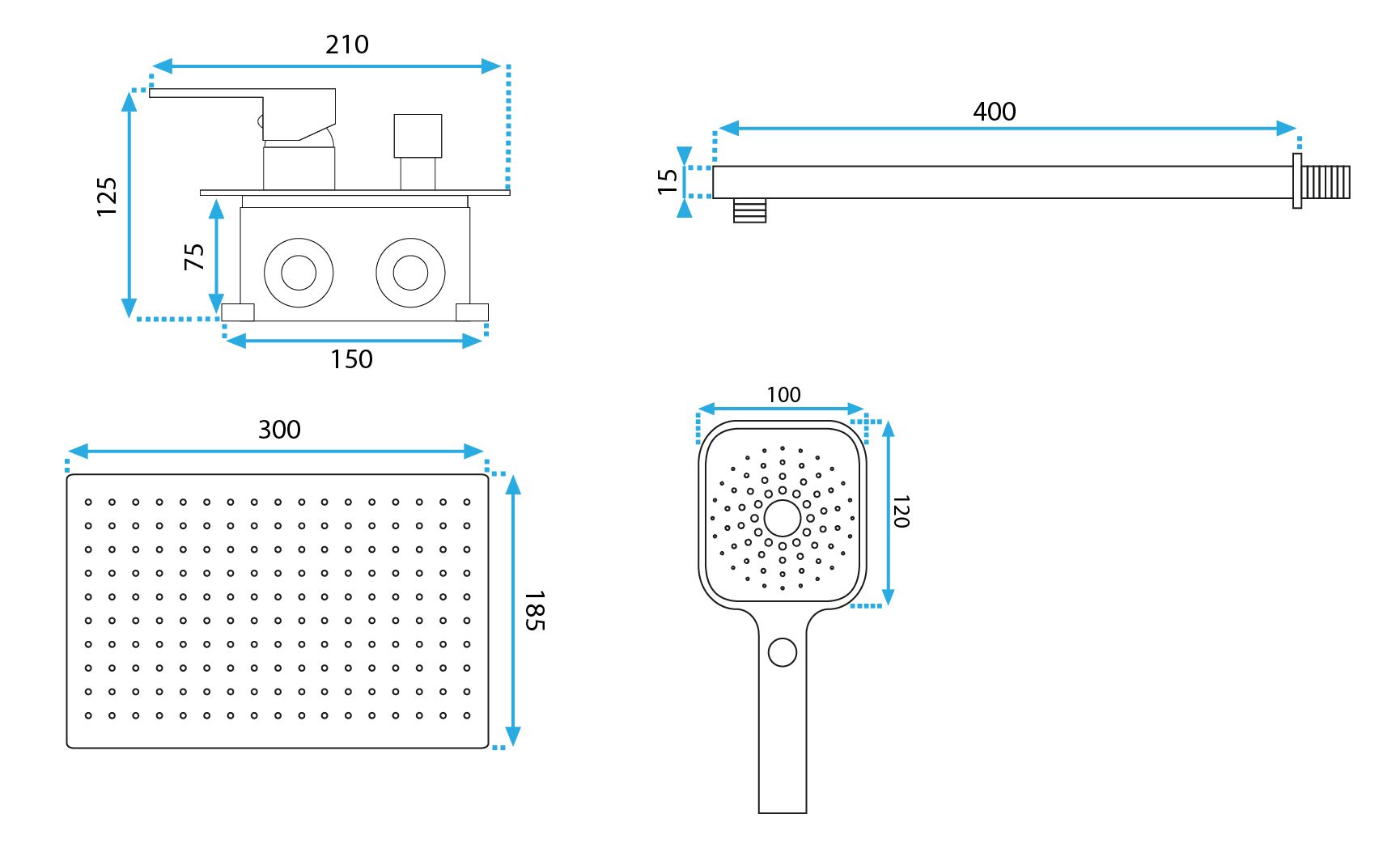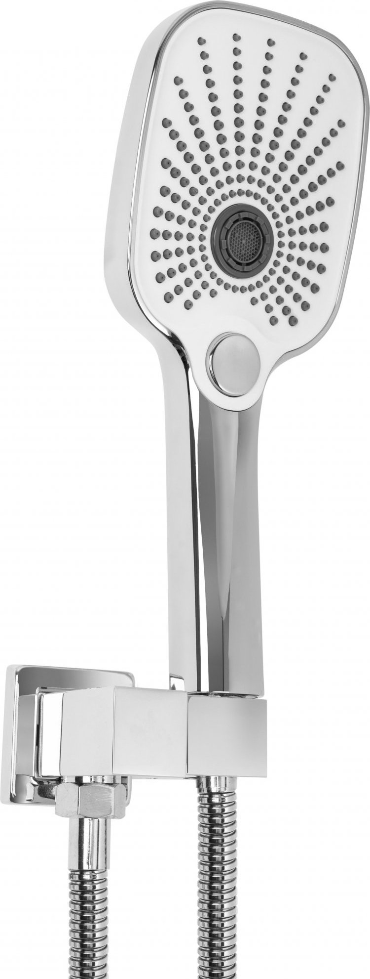 Moderní podomítková souprava v chromovém lesklém provedení se skládá z baterie s mosaznou podomítkovou konstrukcí s krycí deskou vyrobenou z nerezové oceli, horní sprchové hlavice z plastu, vývodu s držákem ruční sprchy z mosazi, opletené 150cm hadicí na ruční sprchy z plastu.