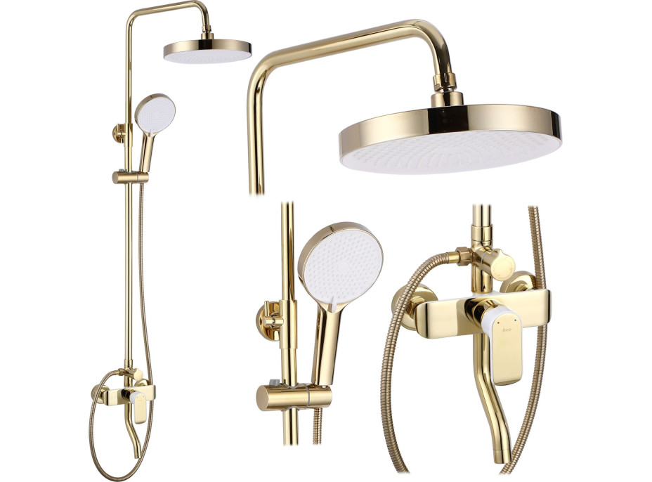 Elegantní oblá sprchová souprava BLOOM vyniká svým moderním a minimalistickým vzhledem. Tělo vodovodní baterie je vyrobeno z mosazi, s ocelovou sprchovou tyčí a plastovými doplňky, které jsou vyrobeny ve zlatém lesklém provedení s bílými doplňky.