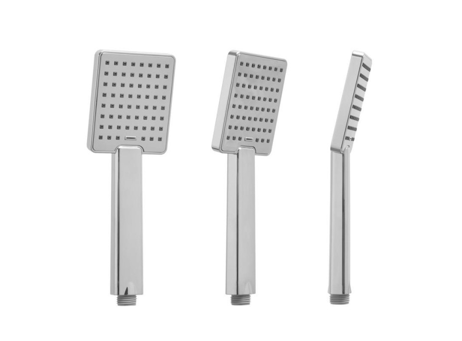 Moderní sprchová souprava v pochromovaném provedení se skládá z mosazné sprchové baterie, sprchové tyče z oceli, horní sprchové hlavice z oceli, odkládací police, držákem pro ruční sprchu a ruční sprchové hlavice a opletené 150cm hadice na ruční sprchu z plastu.