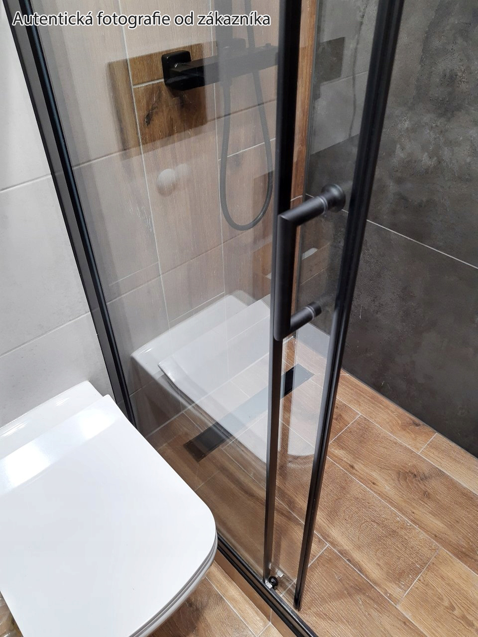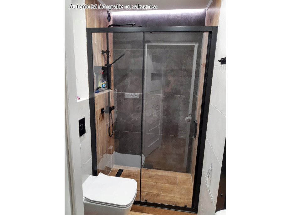 Skvělá volba do každé koupelny. Elegantní sprchové dveře jsou vyrobeny z 5 mm tlustého tvrzeného čirého skla. Aplikovaná povrchová úprava skla zajišťuje maximální komfort všem uživatelům. Tato technologie zaručuje jedinečné vlastnosti zabraňující znečištění skla - povrch stačí pouze opláchnout vodou. Dveře jsou uchyceny v černých hliníkových profilech a jsou vybaveny těsněním zabraňujícím úniku vody mimo sprchový kout. Sprchové dveře jsou posuvné (pojezdy s kvalitními dvojitými kolečky). K otevírání slouží decentní kovová rukojeť.