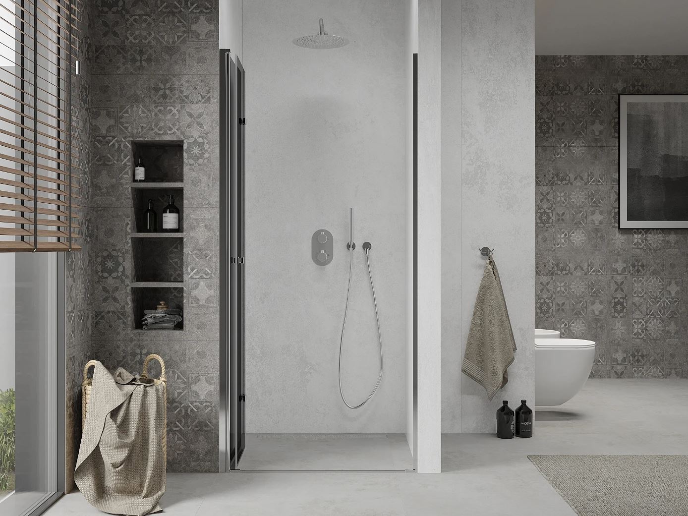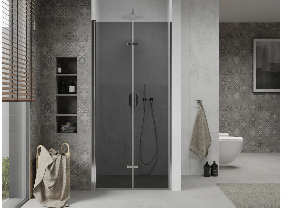 Skvělá volba do každé koupelny. Elegantní sprchové dveře jsou vyrobené z 6 mm tlustého tvrzeného skla v grafitovém (kouřovém) provedení . Aplikovaná povrchová úprava zajišťuje maximální komfort všem uživatelům. Tato technologie vyžaduje jedinečné vlastnosti zabraňující znečištění skla - povrch stačí pouze opláchnout vodou. Dveře jsou uchyceny v chromovaném hliníkovém profilu a jsou únikem těsněním zabraňujícím vody mimo sprchový kout. Sprchové dveře jsou zalamovací (dvě skla spojena kvalitními kalhotkami s možností složení dovnitř i ven). K otevírání slouží decentní kovová rukojeť.