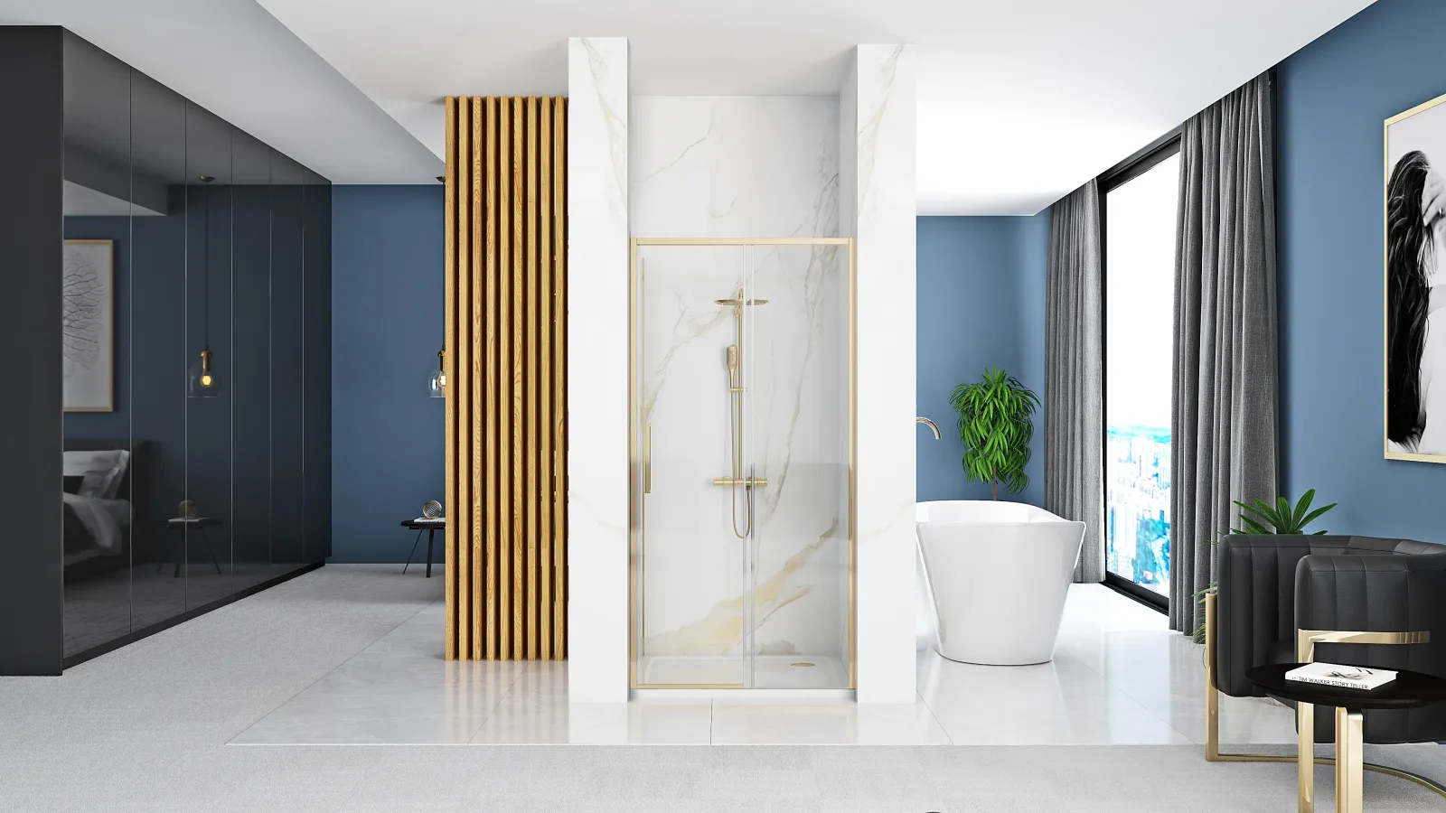 Dveře jsou uchyceny ve zlatých hliníkových profilech a jsou vybaveny magnetickým uzavíráním a těsněním. Díky regulaci v profilech lze vyrovnat mírné nerovnosti stěn. Podlahová lišta zamezí vytékání vody pod dveřmi.