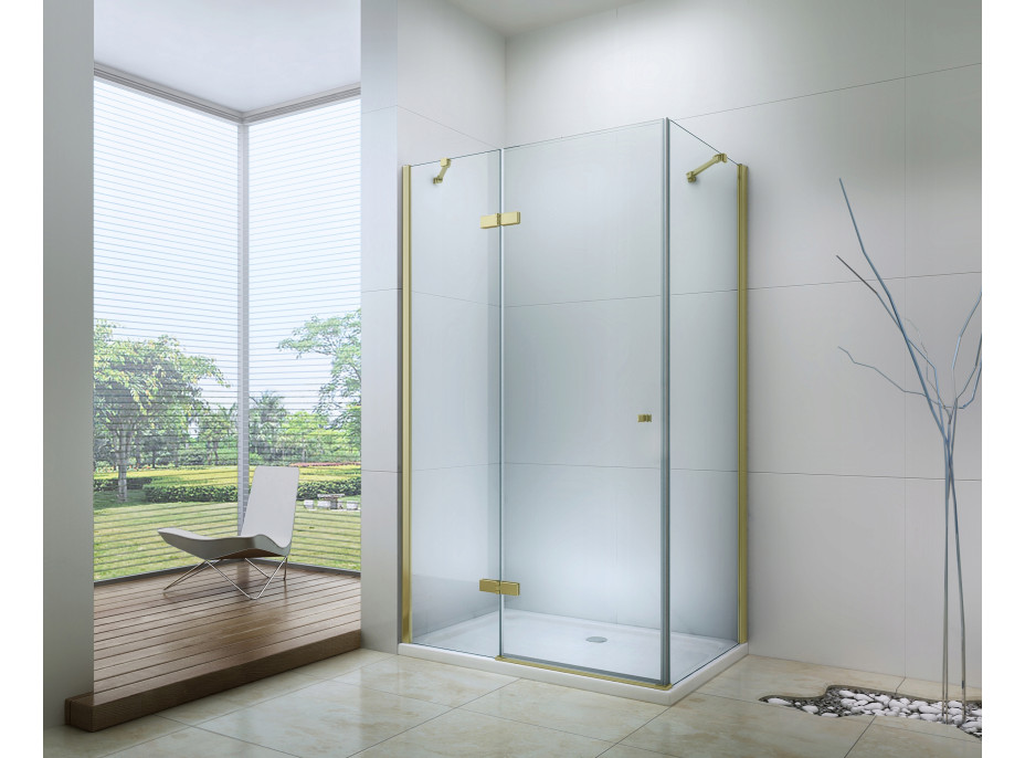 Skvělá volba do každé koupelny. Elegantní sprchový kout je vyroben z 6 mm tlustého tvrzeného skla v čirém provedení. Aplikovaná povrchová úprava skla zajišťuje maximální komfort všem uživatelům. Tato technologie zaručuje jedinečné vlastnosti zabraňující znečištění skla. Kout je uchycen v hliníkových profilech ve zlatou povrchovou úpravou a je vybaven těsněním zabraňujícím úniku vody mimo sprchový kout. Dveře sprchového koutu jsou křídlové. K otevírání slouží decentní kovová rukojeť. Dokonalou stabilitu sprchového koutu zajišťují dvě ukotvující ramena, která jsou součástí výrobku.