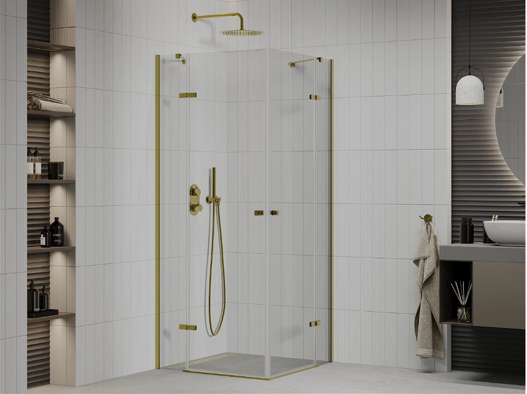 Skvělá volba do každé koupelny. Elegantní sprchový kout je vyroben z 6 mm tlustého tvrzeného skla v čirém provedení. Aplikovaná povrchová úprava skla zajišťuje maximální komfort všem uživatelům. Tato technologie zaručuje jedinečné vlastnosti zabraňující znečištění skla - povrch stačí pouze opláchnout vodou. Kout je uchycen v hliníkových profilech se zlatou povrchovou úpravou a je vybaven těsněním zabraňujícím úniku vody mimo sprchový kout. Dveře sprchového koutu jsou křídlové. K otevírání slouží decentní kovové rukojeti. Dokonalou stabilitu sprchového koutu zajišťují dvě ukotvující ramena, která jsou součástí výrobku.
