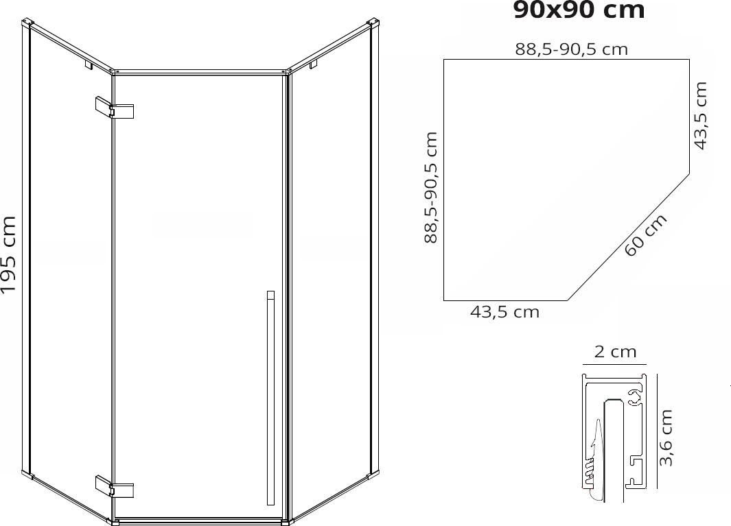 - rozměr: 90x90 cm - nastavitelné v šíři 885-905 mm x 885-905 mm
