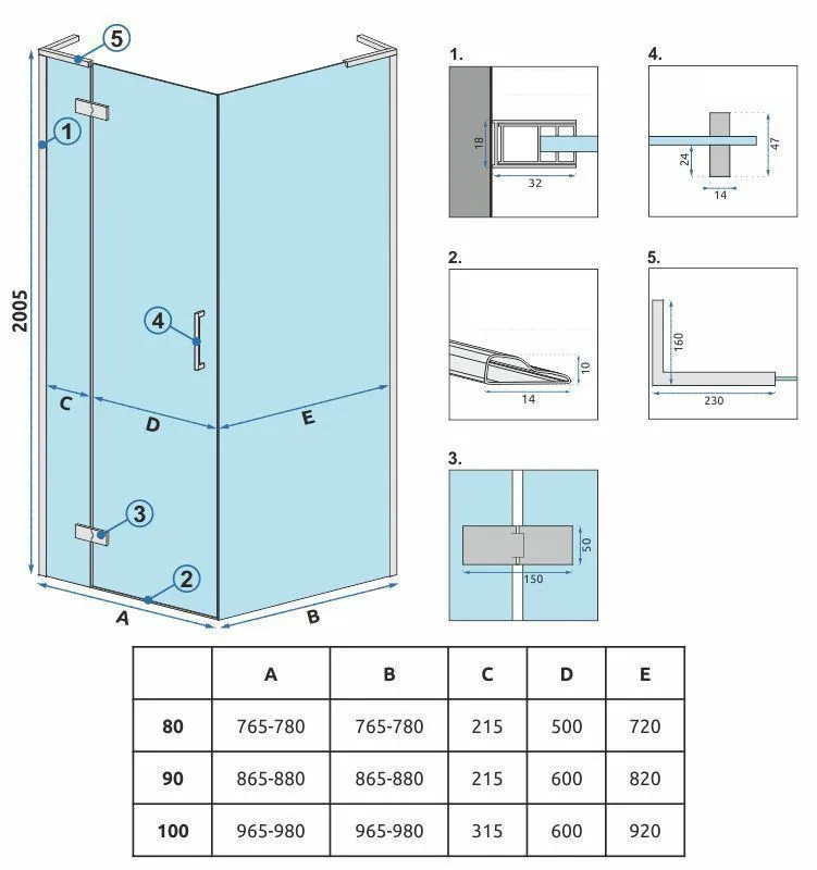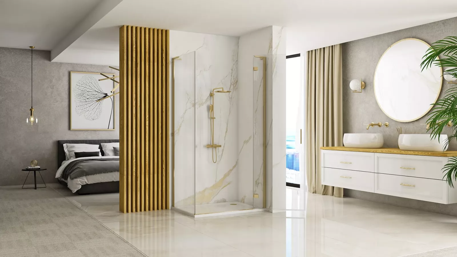 Stěny koutu jsou uchyceny v hliníkových profilech s kartáčovanou zlatou povrchovou úpravou a jsou vybaveny magnetickým uzavíráním a spodním těsněním. Díky regulaci v profilech lze vyrovnat mírné nerovnosti stěn. Podlahová lišta o výšce 10 mm zamezí vytékání vody pod dveřmi.