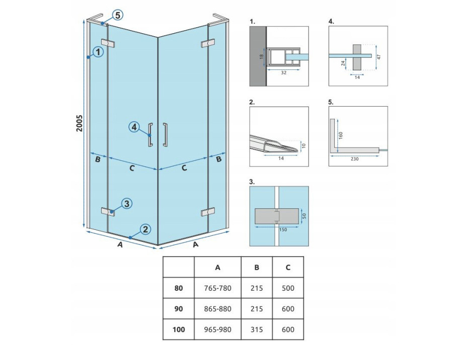 Stěny koutu jsou uchyceny v hliníkových profilech s kartáčovanou zlatou povrchovou úpravou a jsou vybaveny magnetickým uzavíráním a spodním těsněním. Díky regulaci v profilech lze vyrovnat mírné nerovnosti stěn. Podlahová lišta o výšce 10 mm zamezí vytékání vody pod dveřmi.