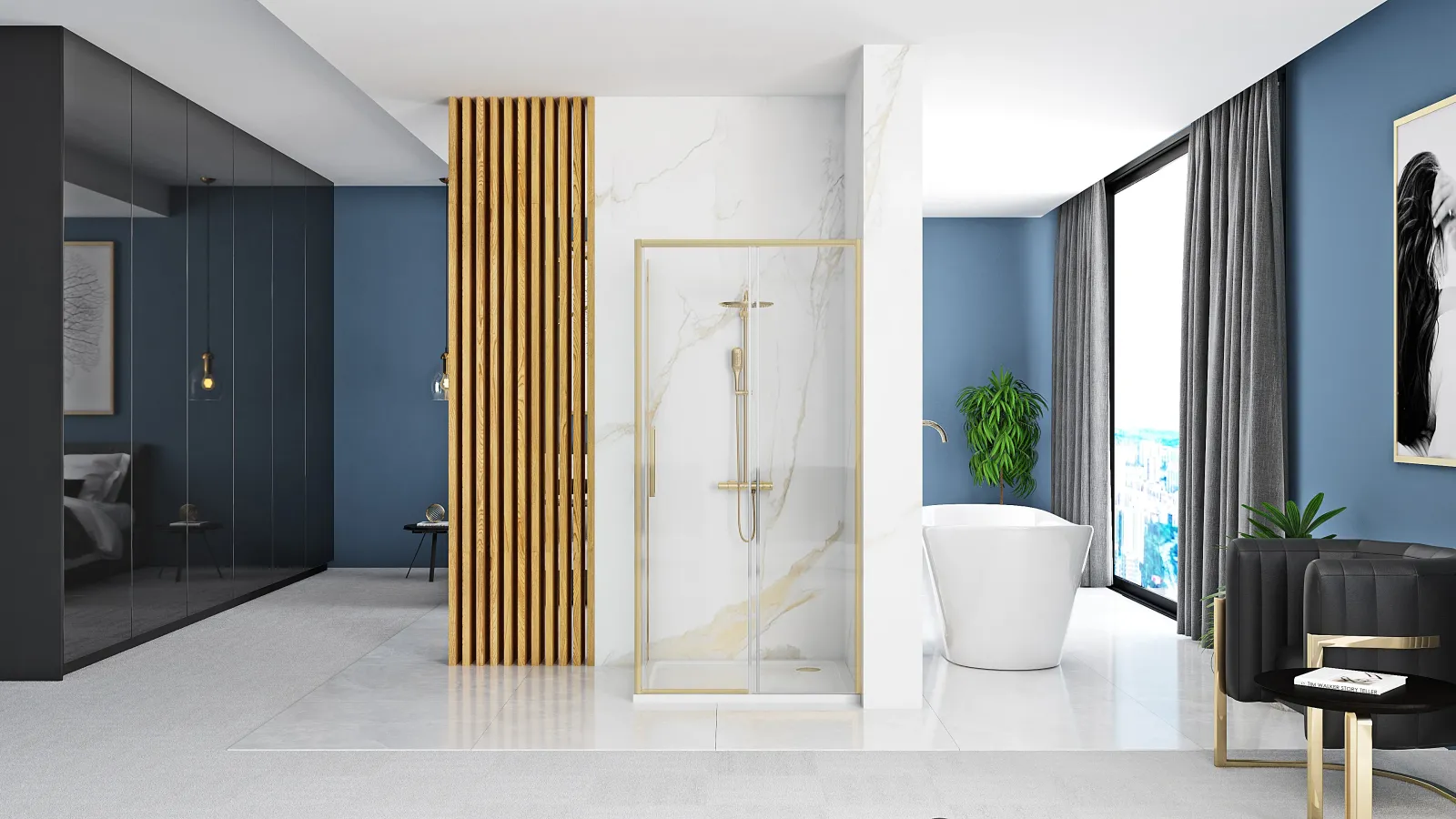 Stěny koutu jsou uchyceny ve zlatých broušených hliníkových profilech a jsou vybaveny magnetickým uzavíráním a spodním těsněním. Díky regulaci v profilech lze vyrovnat mírné nerovnosti stěn. Podlahová lišta o výšce 10 mm zamezí vytékání vody pod dveřmi.