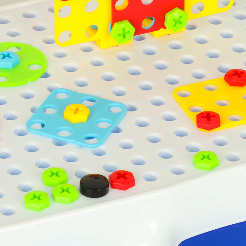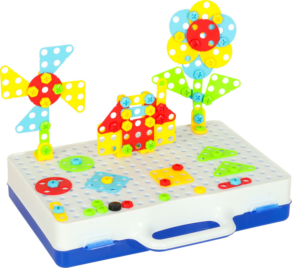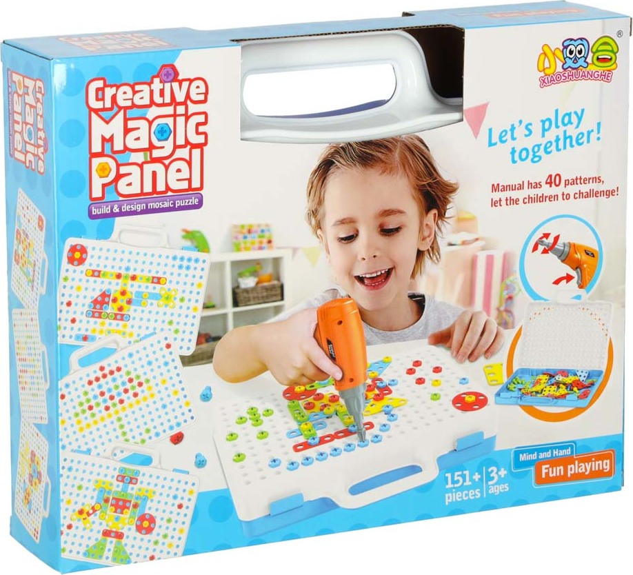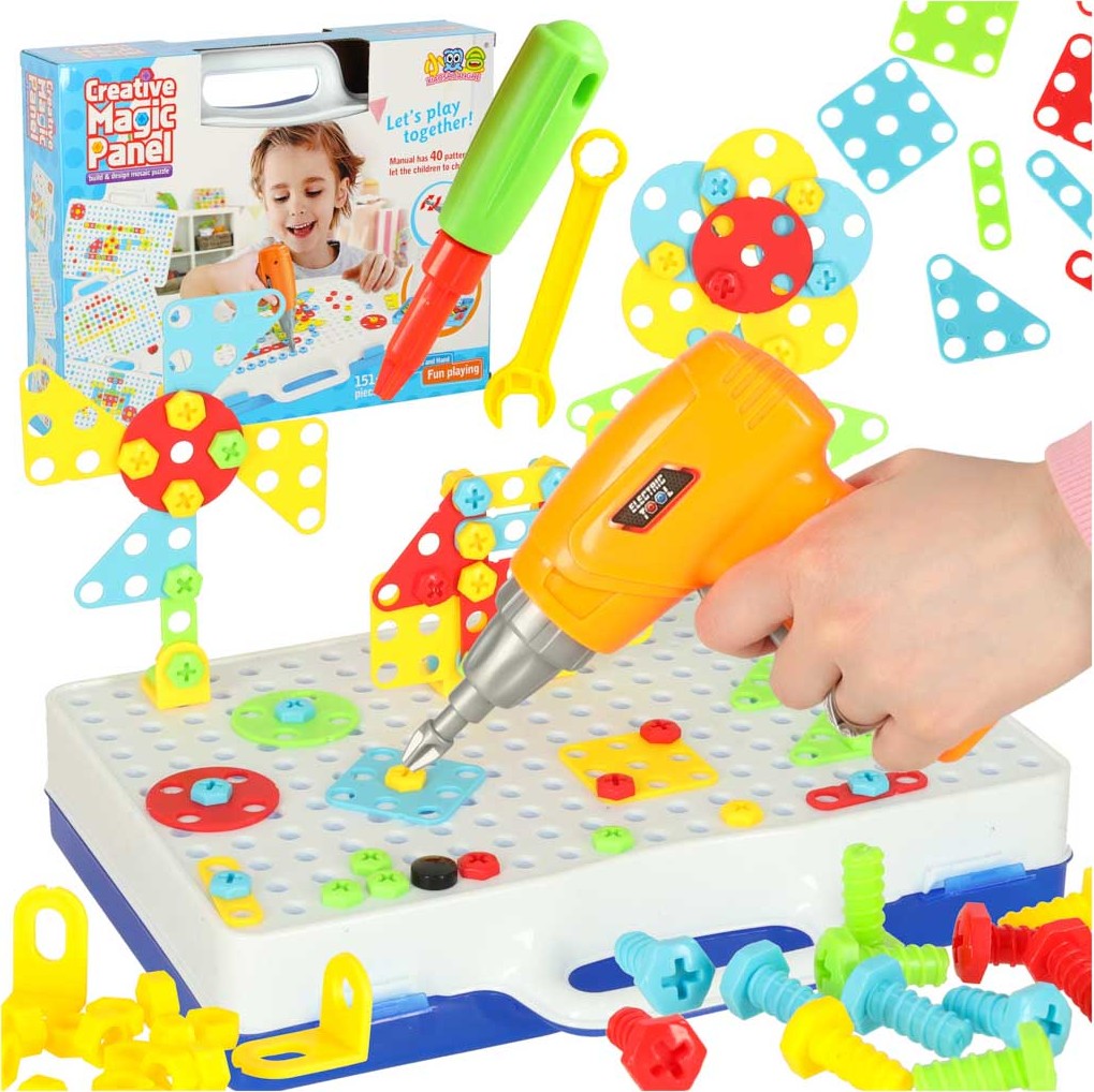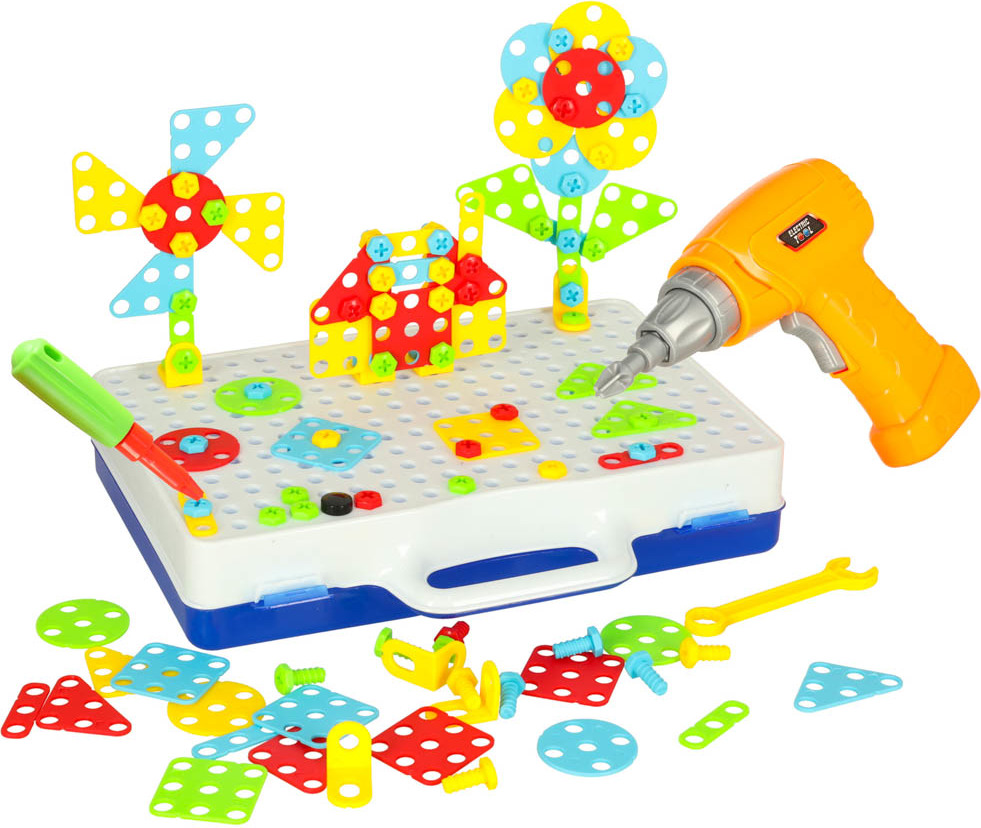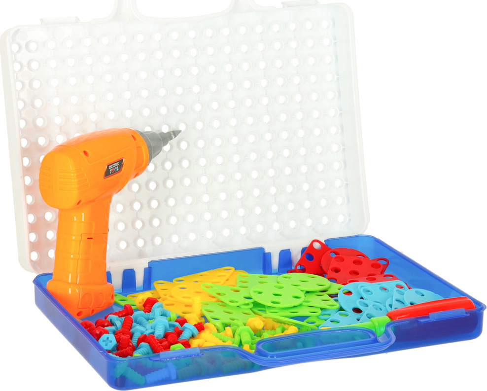 Fantastická skládačka, která zaujme každého malého kutila. Hra spočívá v zašroubování různobarevných šroubků do desky pomocí šroubováku, klíče nebo vrtačky. Po vložení baterií a spuštění se vrtačka otáčí jako skutečné zařízení. Vrtačka je napájena 2 bateriemi AA 1,5 V (nejsou součástí dodávky). Kromě toho vydává zvuky podobné skutečnému zařízení. Vaše dítě se bude cítit jako opravdový kutil.
