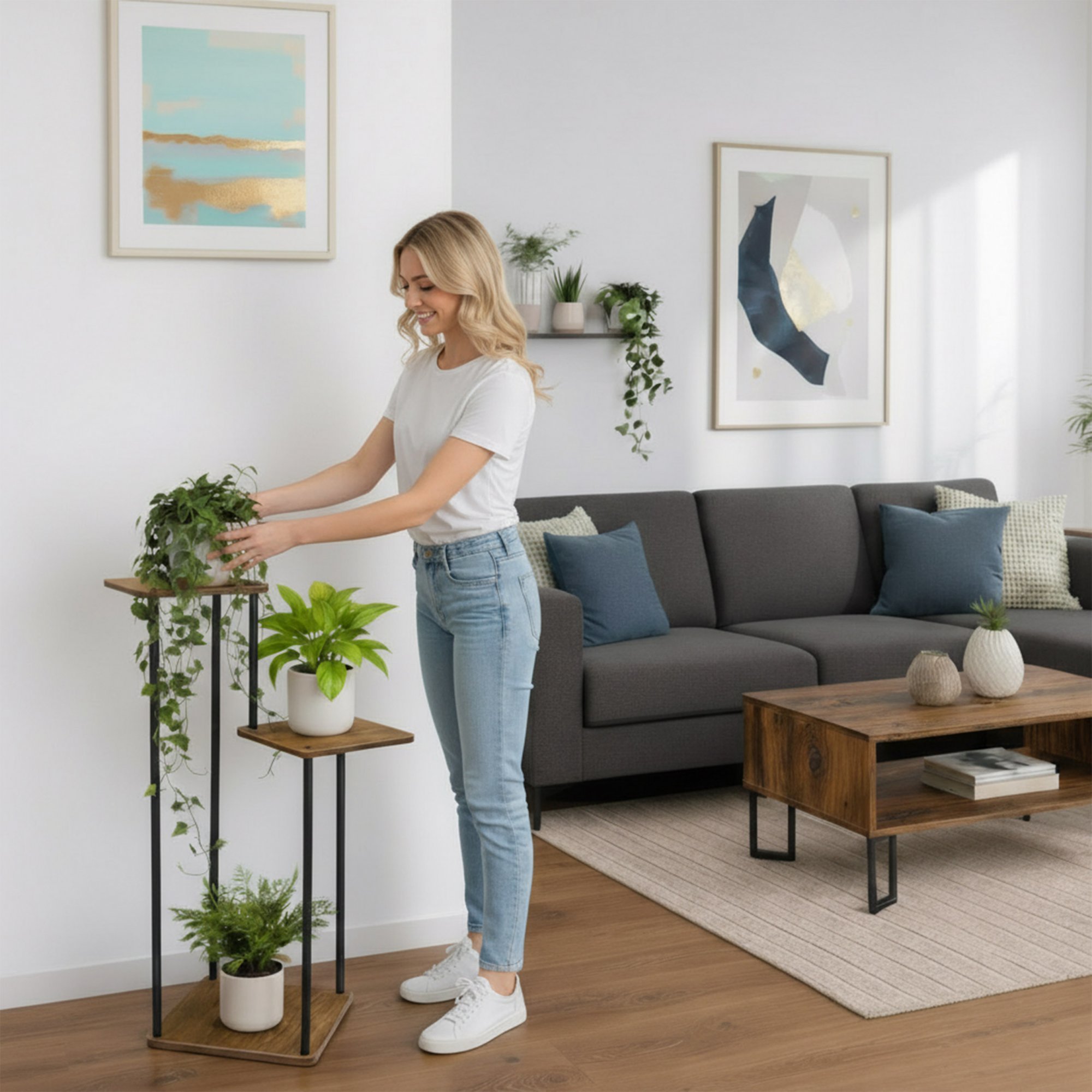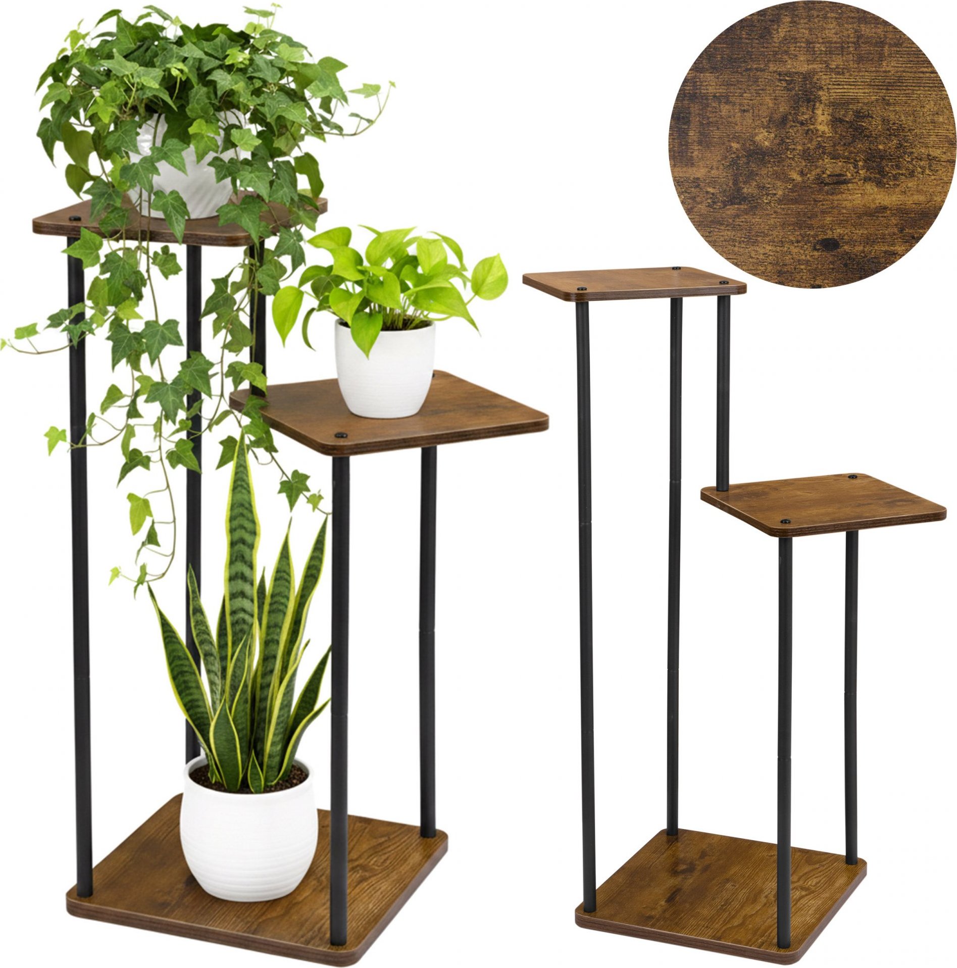 Stojan na květiny Tomas Rustic kombinuje styl a funkčnost, takže je ideální pro prezentaci rostlin. Zjednodušuje organizaci prostoru, umožňuje vám vystavit vaše oblíbené květiny a vnáší do vašeho interiéru teplou rustikální atmosféru v loftovém stylu. Jeho stabilní konstrukce a tři úrovně umožňují umístění více rostlin, aniž by zabíraly velkou podlahovou plochu, zatímco kombinace černé oceli a panelu v barvě dubového dřeva dodává stojanu i dekorativní charakter.