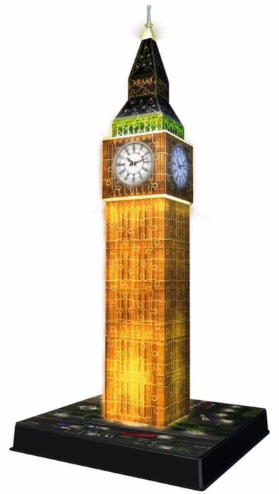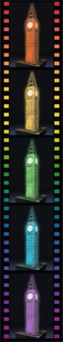 Noční edice slavné londýnské hodinové věže. Stavba se díky LED světlu ve tmě barevně rozzáří. Noční Big Ben je skvělým dárkem i nevšedním kouskem v 3D rozměru. Speciální ohebné dílky, které díky technologii EASYCLICK přesně zapadnou na své místo, umožňují postavit fascinující model dominanty Londýna. Dílky vyrobeny z pevného plastu zaručí vynikající stabilitu a celá stavba drží bez nutnosti lepení. Díky originálním doplňkovým dílkům budou vaši stavbu všichni obdivovat. Balení obsahuje puzzle, příslušenství včetně LED a návod.