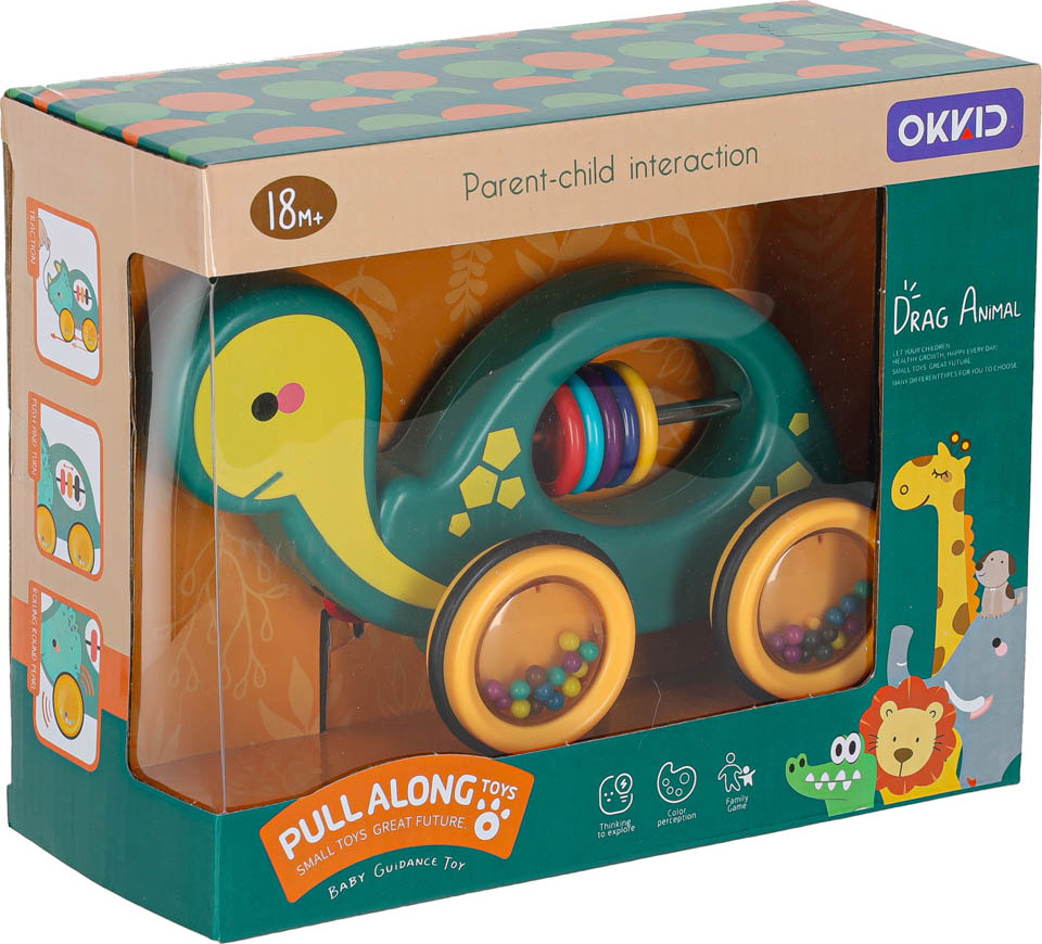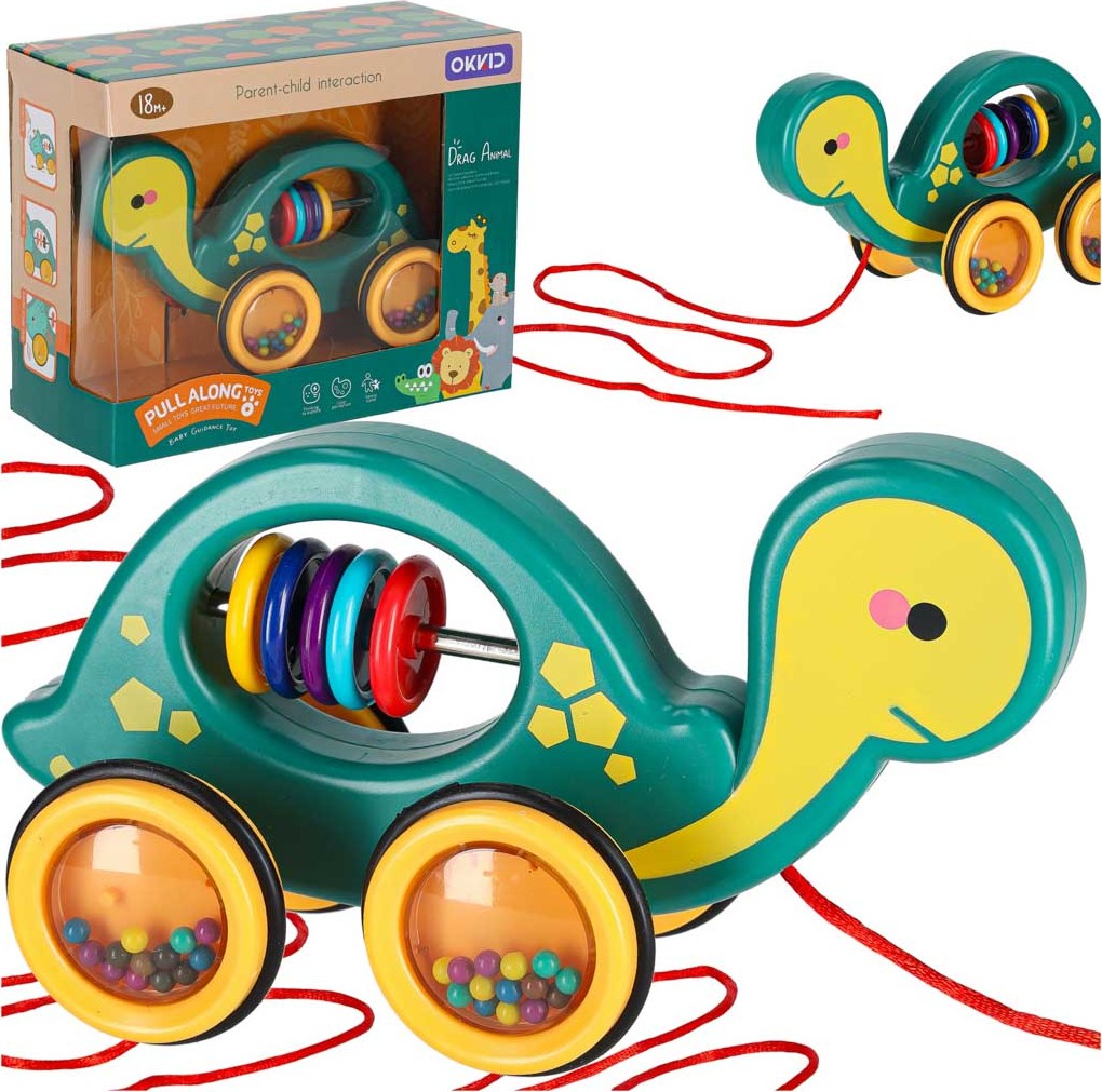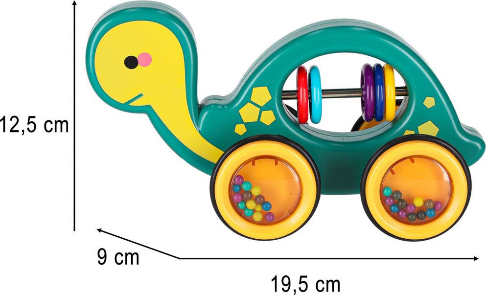 Krásný design jistě upoutá pozornost každého batolete a želvičku si hned zamiluje! Uvnitř želvy se nachází barevné chrastítko, jehož zvuky povzbudí dítě ke společné hře! K hračce je připevněn dlouhý provázek, na kterém ho můžete pohodlně tahat! To vám umožní vzít želvu na dlouhou procházku a zažít velké dobrodružství! Když navíc želva jezdí, míčky umístěné v jejích kolečkách budou chrastit!