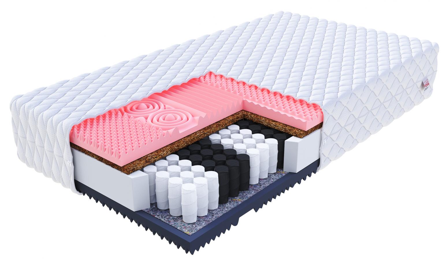 Složení matrace: taštičkové pružiny, polyuretanová pěna s hustotou 25 kg/m3, přírodní filc, přírodní kokosové vlákno, termoplastická paměťová pěna s hustotou 30 kg/m3, studená pěna HR s hustotou 30 kg/m3