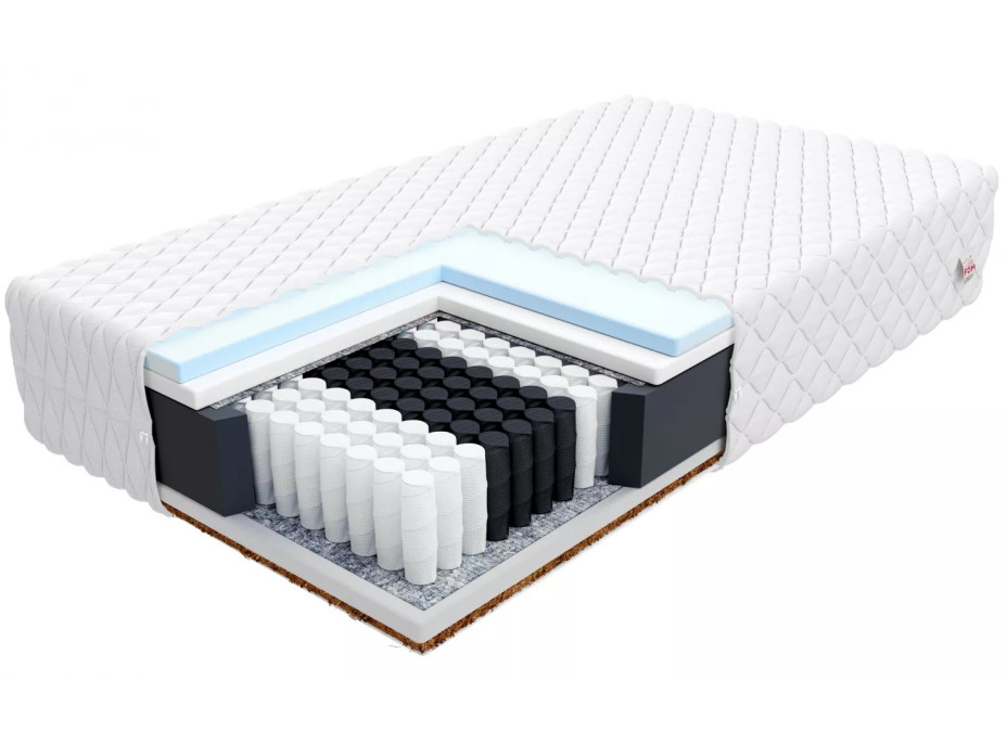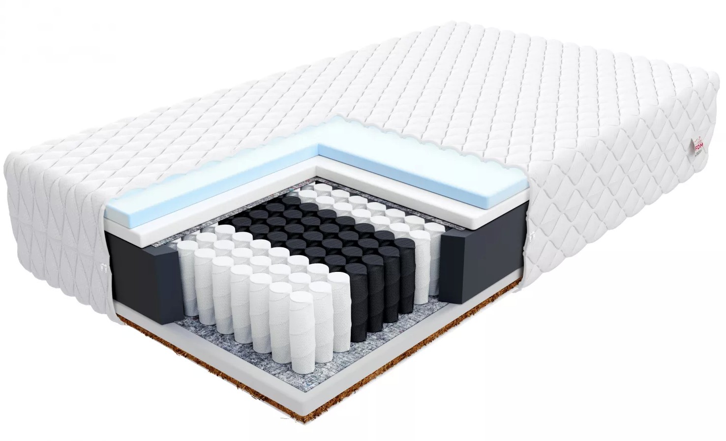 Složení matrace: taštičkové pružiny, polyuretanová pěna s hustotou 25 kg/m3, přírodní filc, 100% přírodní kokosové vlákno, studená pěna HR s hustotou 30 kg/m3