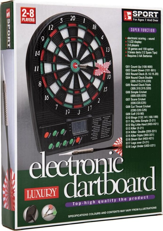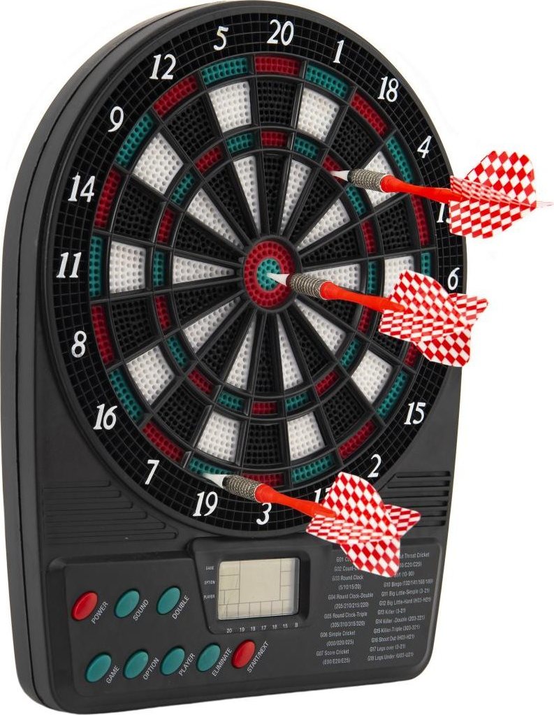 ada obsahuje: elektronický terč o rozměru 20x26 cm se 3 šipkami a 12 náhradními hroty.