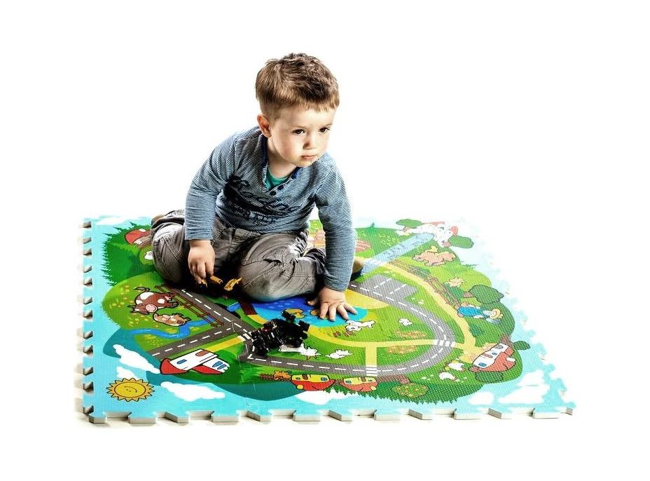 Zábavné hraní na vesnici! Pěnové podlahové puzzle bez vyjímatelných částí s barevnými zvířátky, domečky a silnicemi je ideální pro rozvoj dětské fantazie. Doplňte hrací plochu o libovolná autíčka, stromy, figurky lidí a zvířátek či stavby z kostek a sdílejte s dětmi jejich příběhy. Pěnový koberec je omyvatelný, zdravotně nezávadný, tlumí hluk a skvěle izoluje. Tloušťka 1,2 cm. Pro děti od 3 let. Otírejte vlhkým hadříkem. Rozměr složeného puzzle cca 87 x 87 cmVlastnosti