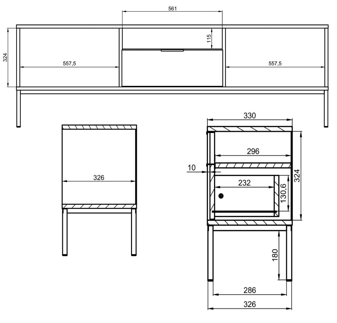 TV stolek Austin je vyrobený z laminované dřevotřísky o tloušťce 18 mm, která zaručuje životnost a odolnost proti poškození. Navíc díky kombinaci zlatých hliníkových úchytů a ocelového rámu s práškovým nástřikem se stolek dokonale hodí do různých stylů interiéru, od klasických po moderní. K dispozici je ve 2 velikostech: 135 cm a 175 cm, najde se pro něj místo jak v menším obývacím pokoji, tak i v tom prostorném. Centrálním prvkem je výsuvná zásuvka, ideální pro uspořádání menších předmětů. Nad ním je otevřená police - ideální pro herní konzoli nebo jiná multimediální zařízení, poskytuje snadný přístup a dostatečný prostor. Po stranách jsou 2 prostorné uzavíratelné skříňky, které nabízejí dostatek prostoru pro různé předměty, jako jsou DVD, videohry nebo další příslušenství.