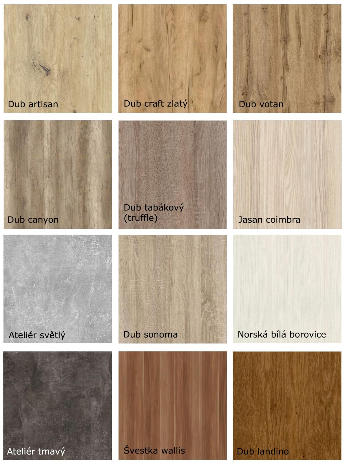 Vybrat si můžete ze spousty dekorů, abyste dokonale sladili stolek s obývacím pokojem. Na výběr máte z tmavého wenge, ořechu wenge, arusha wenge, ořechu ecco, dubu landino, tmavého ořechu, dubu sonoma, jasanu coimbra, dubu sonoma tabákového, calvados, švestky, olše, černé matné barvy, norské borovice černé nebo bílé, dubu san remo nebo velmi oblíbeného dubu craft zlatého, který naleznete i na fotografiích produktu.