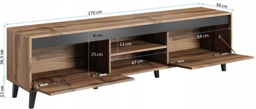Stylový televizní stolek NORD ve skandinávském stylu se hodí do každého interiéru. Skládá se ze dvou výklopných stkříněk oddělených policí po stranách a z otevřených polic v prostřední části. Výklopná čela dvířek nemají úchyt, otevírají se pomocí systému push-click. To dodává stolku minimalistický, elegantní vzhled. Lamino desky, ze kterých je stolek vyrobený, jsou kvalitní, stabilní a dlouho vydrží. Plastové černé 12cm nožičky dodávají stolku moderní vzhled. Televizní stolek je výráběn v dekoru dub wotan v kombinaci s antracitovou barvou.