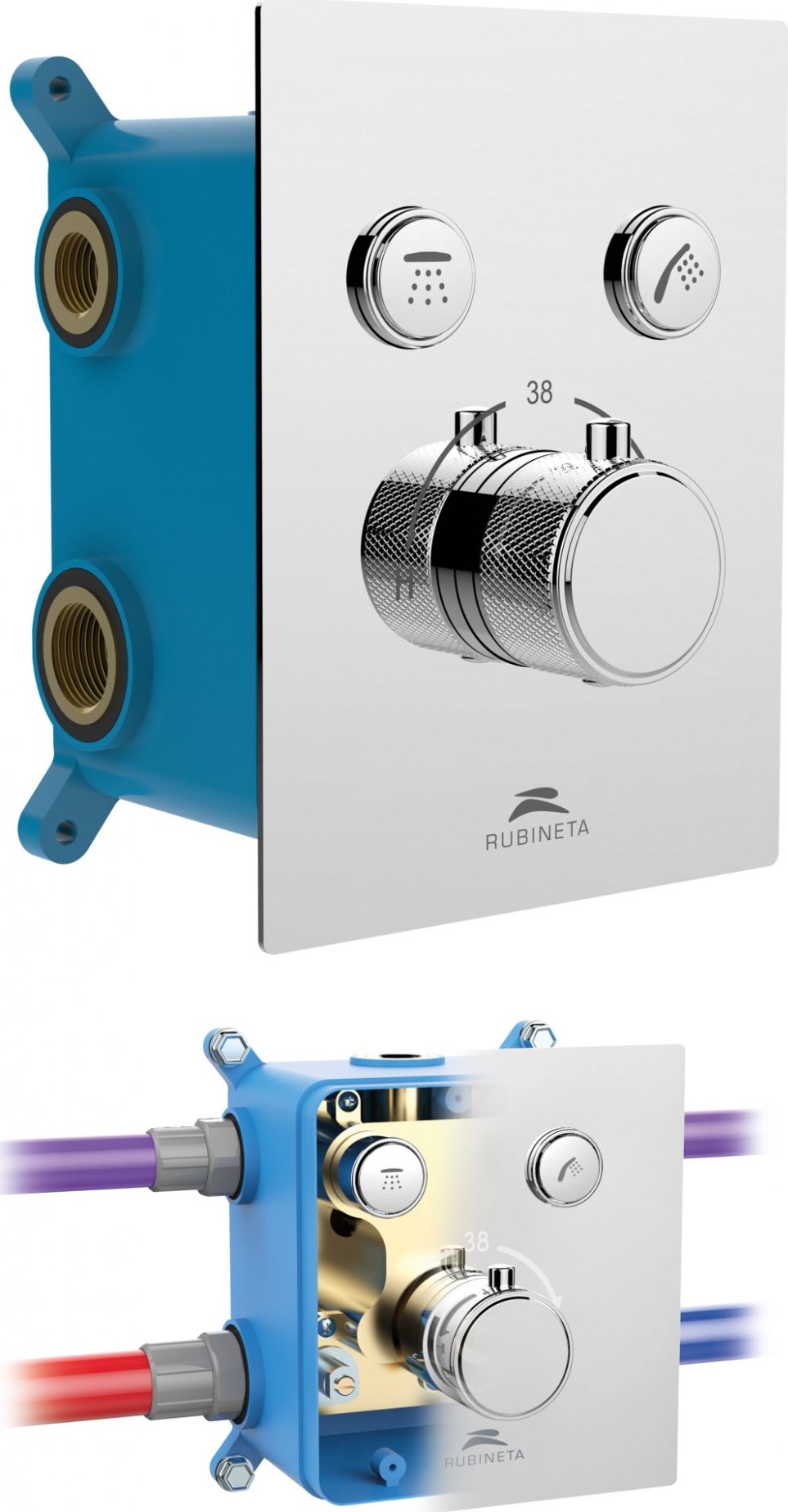 Vodovodní baterie Thermo-2F ze série THERMO je vyrobena z vysoce kvalitních materiálů, které zajišťují velmi dlouhou životnost a spolehlivost. Vnitřní konstrukce podomítkové baterie Thermo-2F je konstruována s ohledem na šetrnost ke spotřebě vody. Baterie obsahuje podomítkový box. V naší nabídce naleznete bohaté příslušenství k této baterii - sprchové děšťové i ruční hlavice, ramena dešťové sprchy, držáky ruční sprchy a sprchové hadice.