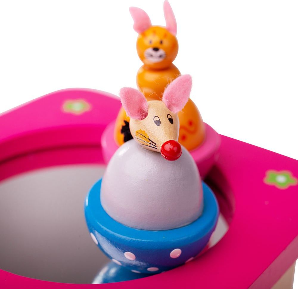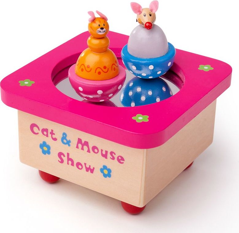 Natočte je a poté je pozorujte! Tyto krásné tančící postavičky se viklají a otáčejí na hrací skříňce, která má ve vrchní části zrcadlo. Kočka a myška jsou k zrcadlové ploše připevněni magnetem, lze je jednoduše oddělit a děti si tak s nimi mohou hrát na stole nebo zemi. Krásný doplněk do pokojíčku nebo školky. Podporuje kreativní a představivou hru. Vyrobeno z kvalitních materiálů z odpovědných zdrojů. Odpovídá evropské bezpečnostní normě.