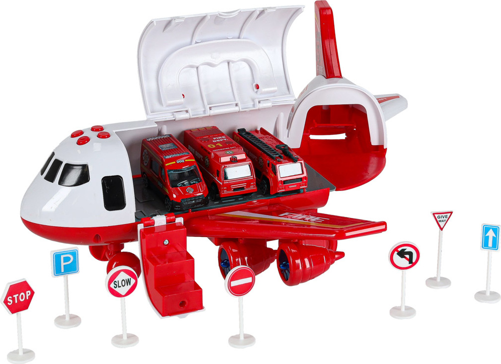 V sadě najdetet také 7 dopravních značek. Všechny další prvky se vejdou dovnitř letadla. Letadlo je vybaveno 4 tlačítky. Každé z nich je zodpovědné za jiný zvukový signál, velmi reálné signály vysílané skutečnými službami. Stisknutím tlačítek se spustí nejen zvuk, ale aktivují se také blikající světla LED na křídlech a pod kokpitem. Na vrcholu hračky se nachází šikovná rukojeť,pro snadné otevírání a přenášení letadla. Křídla letadla jsou odnímatelná, takže zabírá méně místa. Hračky, letadlo i vozidla, jsou vybaveny koly, aby je bylo možné snadno přemisťovat na místě zásahu.