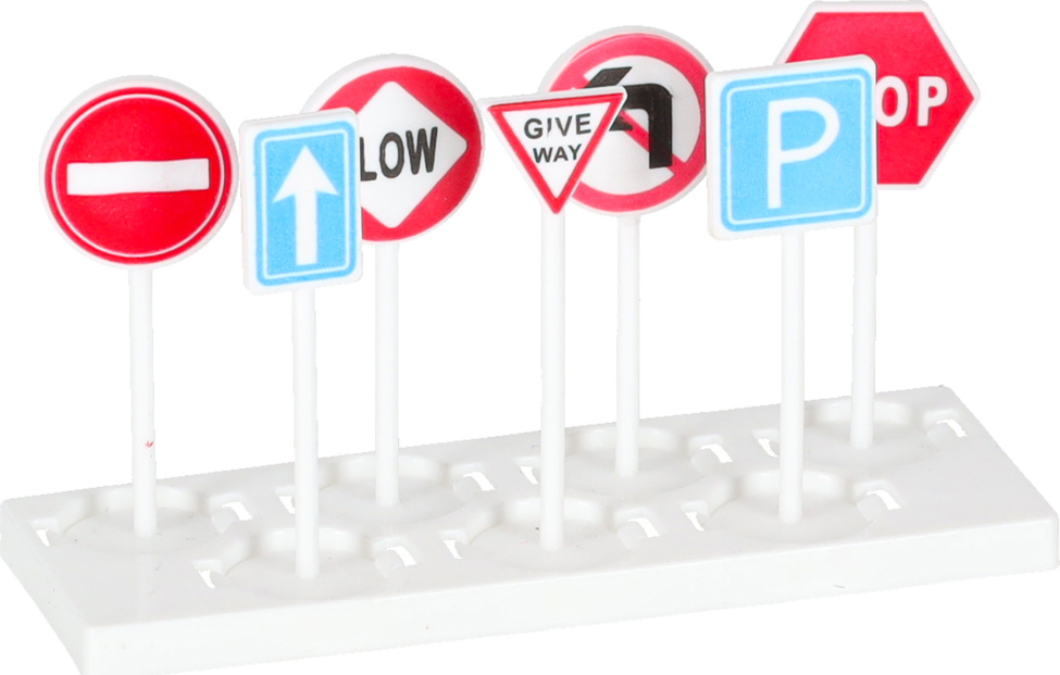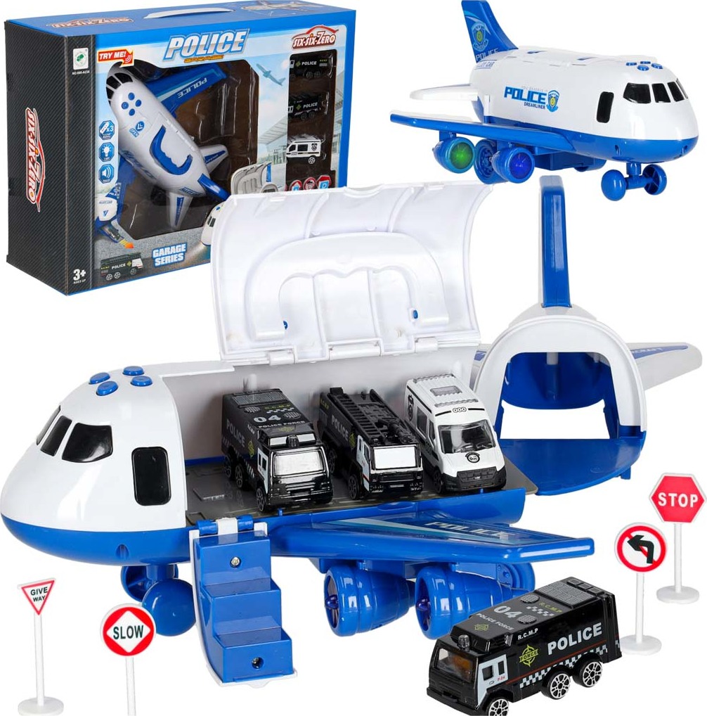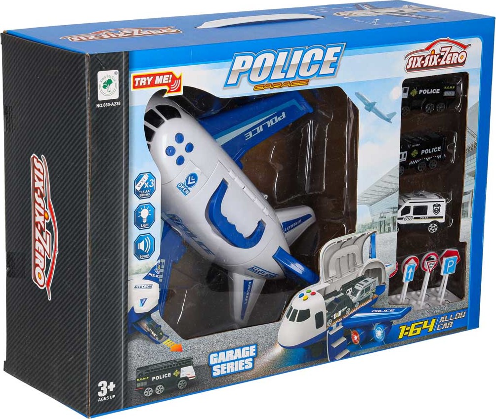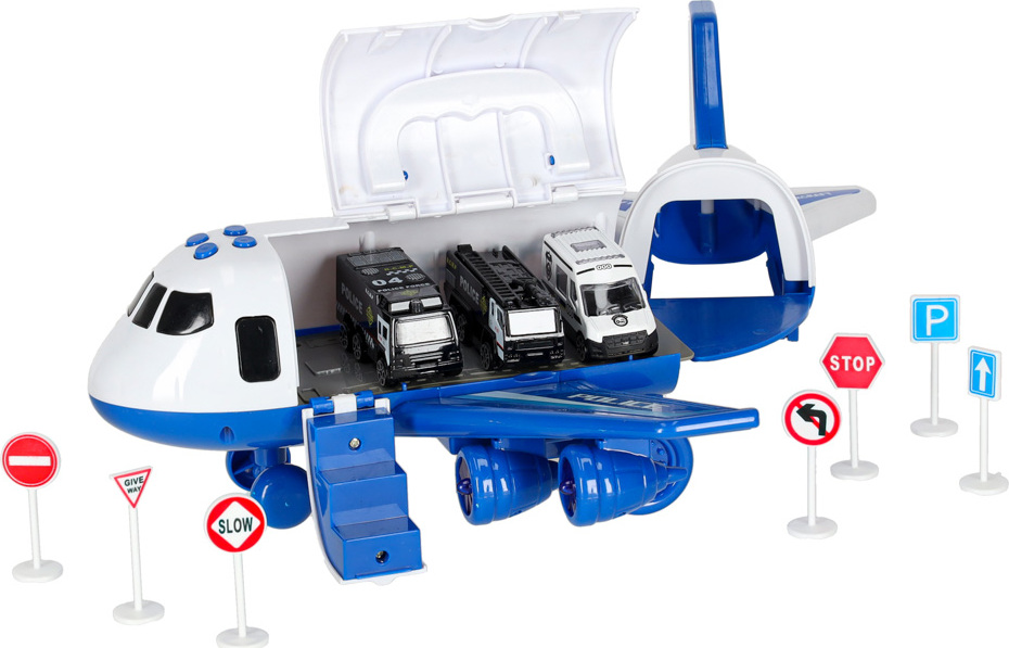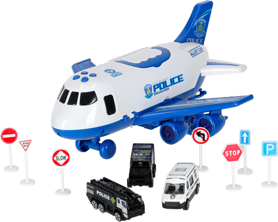 Sada obsahuje také sadu 7 dopravních značek. Všechny další komponenty se vejdou do letadla. Letadlo je vybaveno 4 tlačítky, z nichž každé je zodpovědné za jiný zvukový signál, který velmi realisticky replikuje signály vydávané skutečnými policisty. Stisknutím tlačítek se nejen aktivuje zvuk, ale také se aktivují blikající LED diody umístěné na křídlech a pod kokpitem. Na horní straně hračky se nachází praktická rukojeť, která usnadňuje otevírání a přenášení letadla. Křídla letadla jsou odnímatelná, což šetří místo. Hračky, jak letadlo, tak i vozidla, jsou vybaveny kolečky pro snadný přístup k místu činu. Zloduchové, třeste se! Tento policejní tým porazí každého zločince!
