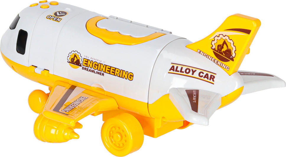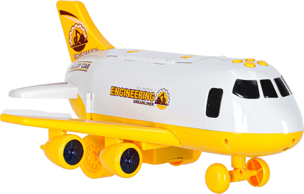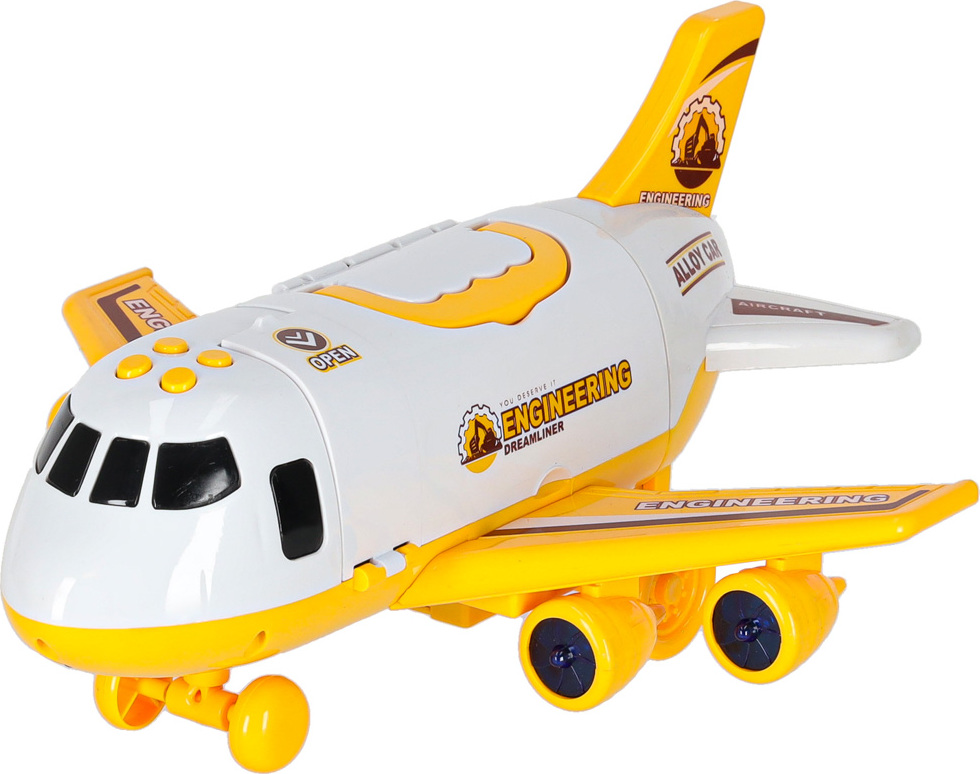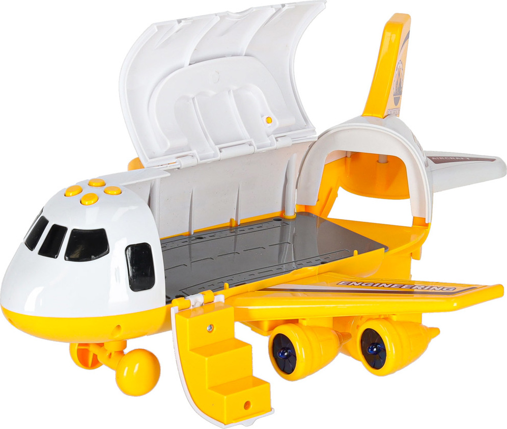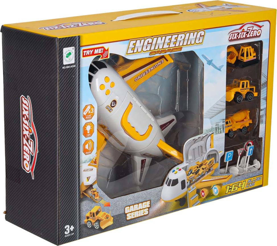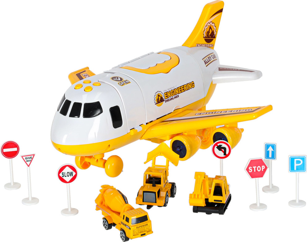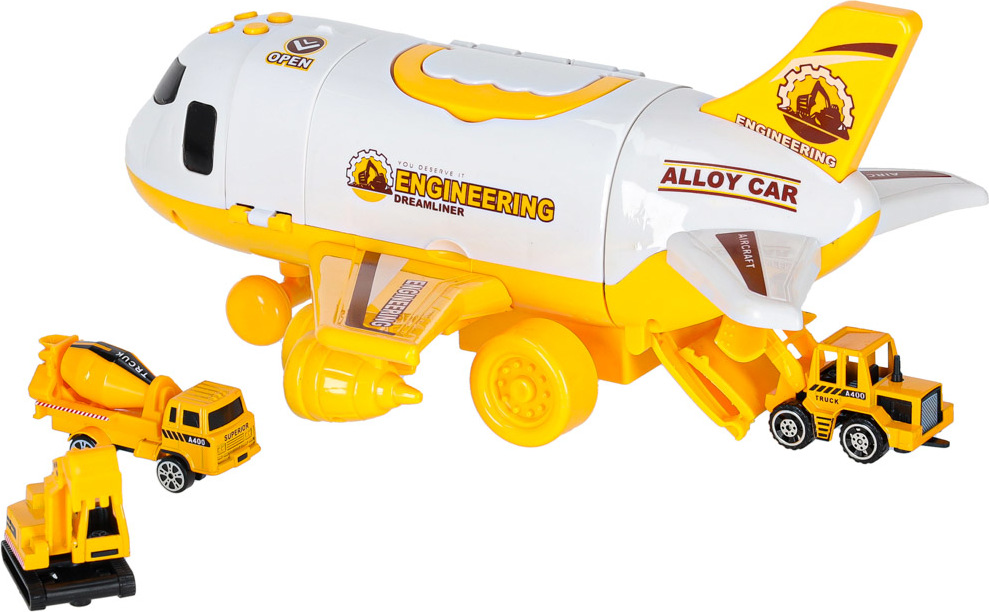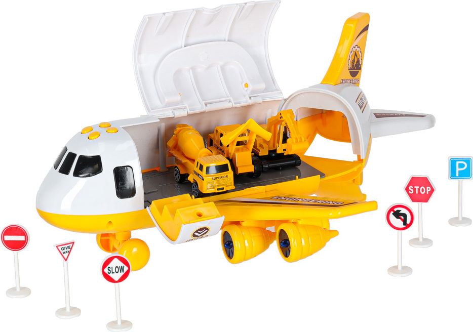 Postavme společně nový dům... nebo celou čtvrť! Potřebné stavební vybavení dovezeme letecky. Velké letadlo dokáže přepravit přiložená auta a značky. Obrovský a ambiciózní stavební projekt by se neobešel bez těžkých stavebních strojů. Žádná slušná stavba by se neobešla bez bagru a míchačky betonu! Použijte letadlo k přepravě vybavení na staveniště. Stejně jako skutečný transportér těžké techniky má letadlo na ocase spouštěcí rampu, která umožňuje vjezd vozidel. Otevírá se také z boku pro snazší manévrování s hračkami uvnitř.
