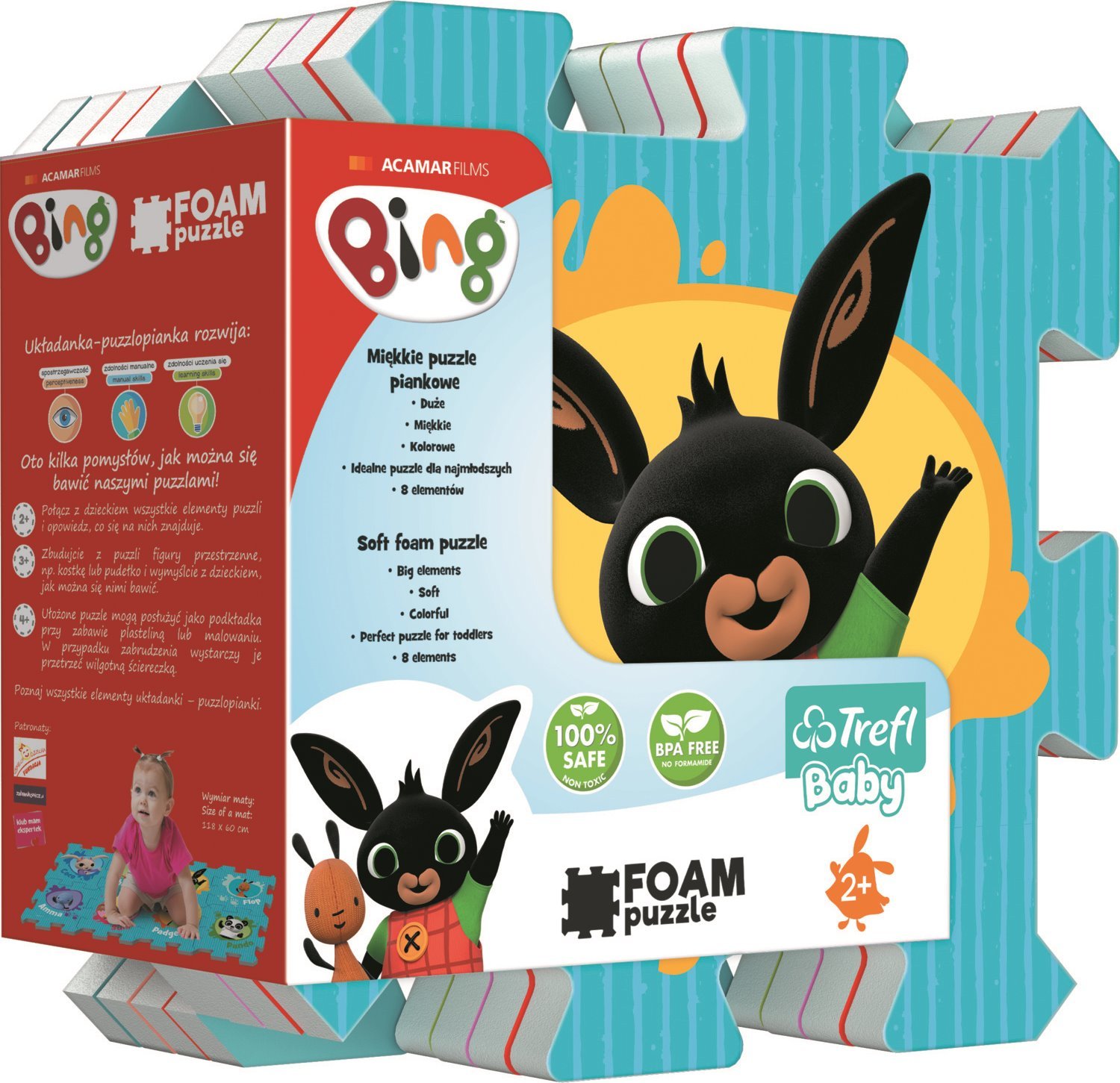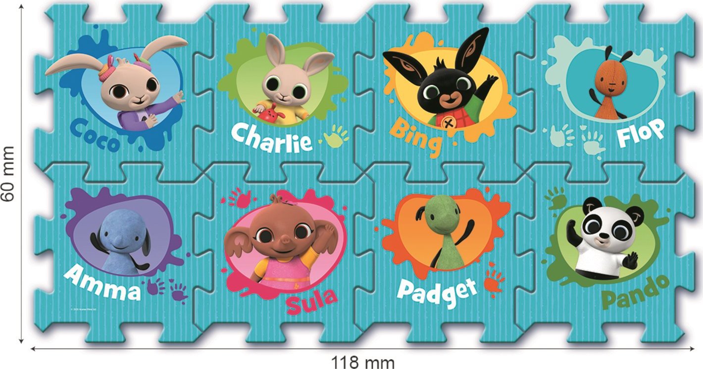 Pěnové puzzle s krásnými obrázky králíčka Binga a jeho přátel. Pěnová podložka je vyrobena ze speciálního materiálu (nejedná se o klasickou vroubkovanou EVA pěnu, ale o materiál podobný silné karimatce nebo několikavrstvému mirelonu). Má nadstandardní tloušťku 1,5 cm a je určena zejména ke hraní. Puzzle je měkké, omyvatelné, zdravotně nezávadné, je lehce manipulovatelné a skladné. Z jednotlivých dílů lze poskládat kostku, tunel pro autíčka nebo jej lze použít jako krásnou dekoraci na stěnu. Z osmi samostatných dílů lze vytvořit plochu přibližně 117 x 60 cm. Pěnové puzzle TREFL PUZZLOPIANKA je vhodné také jako podložka při hraní s plastelínou nebo malování barvičkami. Po použití puzzle jednoduše otřete vlhkým hadříkem. Toto puzzle je kombinovatelné pouze s pěnovými puzzle TREFL Puzzlopianka Doporučeno pro děti od 2 let. Rozměr složeného puzzle cca 118 x 60 cmVlastnosti