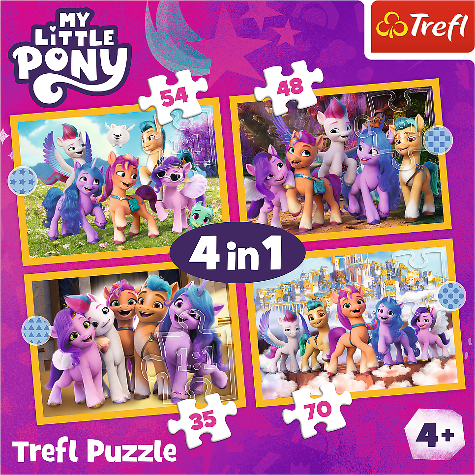 Dětské puzzle TREFL s motivem animovaného filmu My Little Pony. Progresivní puzzle s různou obtížností - 4 puzzle s 35 - 70 dílky. Rozměr složeného puzzle cca 28,5 x 20,5 cmVlastnosti