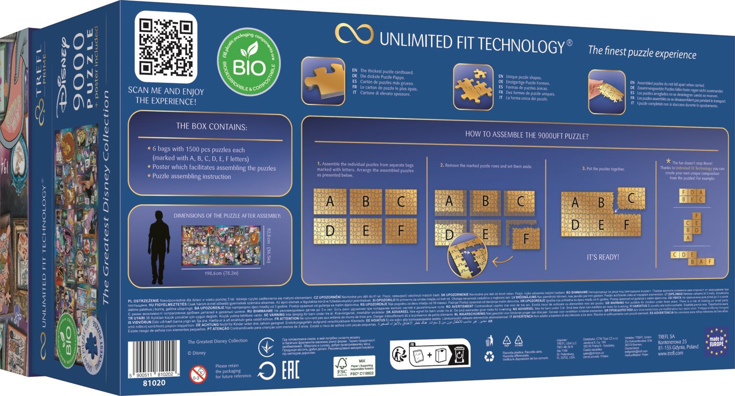 Poskládejte si obrovské puzzle s ikonickými postavami z pohádkového světa Disney. Každý obrázek je balen samostatně (6x1500 dílků). Díky technologii TREFL Unlimited Fit Technology (UFT) , která umožňuje spojení jednotlivých obrázků mezi sebou, můžete vytvořit libovolnou kompozici obrázků nebo se držet rozmístění dle předlohy. Nejvyšší kvalita - puzzle je vyrobeno z nejsilnějšího modrého kartonového podkladu. Unikátní technologie UFT umožňuje vytvoření vlastní kompozice. Puzzle dílky drží u sebe - poskládané obrázky je možné pohodlně přemisťovat, aniž by se složený motiv rozsypal. Bio balení - bez svrchní plastové folie. Vnitřní sáček je zcela biologicky rozložitelný a kompostovatelný. Puzzle je baleno v šesti samostatných sáčcích po 1500 dílcích. Součástí balení je i papírová předloha o rozměru 676x452. Rozměr složeného puzzle cca 198,6 x 92,8 cmVlastnosti