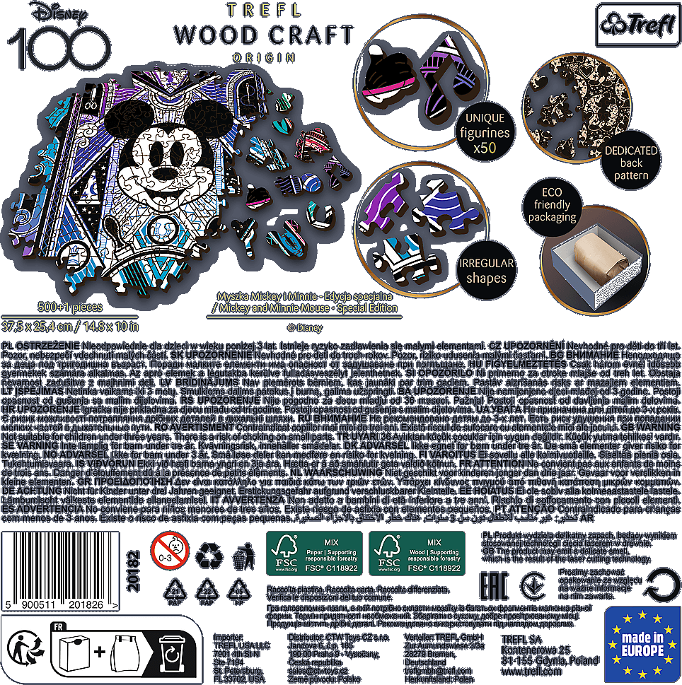 Dřevěné oboustranné puzzle TREFL z prémiové řady Wood Craft Origin se speciálně tvarovanými dílky ve tvaru slavných budov, dopravních prostředků nebo třeba zvířat. Puzzle je vyrobeno ze silné dřevovláknité desky a vyřezáno laserem, díky čemuž jsou okraje hladké a dílky do sebe lehce zapadají. vysoká kvalita a precizní zpracování laserem až 50 unikátně tvarovaných dílků ve tvaru budov, předmětů a zvířat ostatní dílky v nepravidelných tvarech puzzle je oboustranné - z jedné strany obrázek, z druhé strany vzor ekologické balení - zcela bez plastových obalů Součástí balení je předloha skládaného motivu. Rozměr složeného puzzle cca 37,5 x 25,4 cmVlastnosti