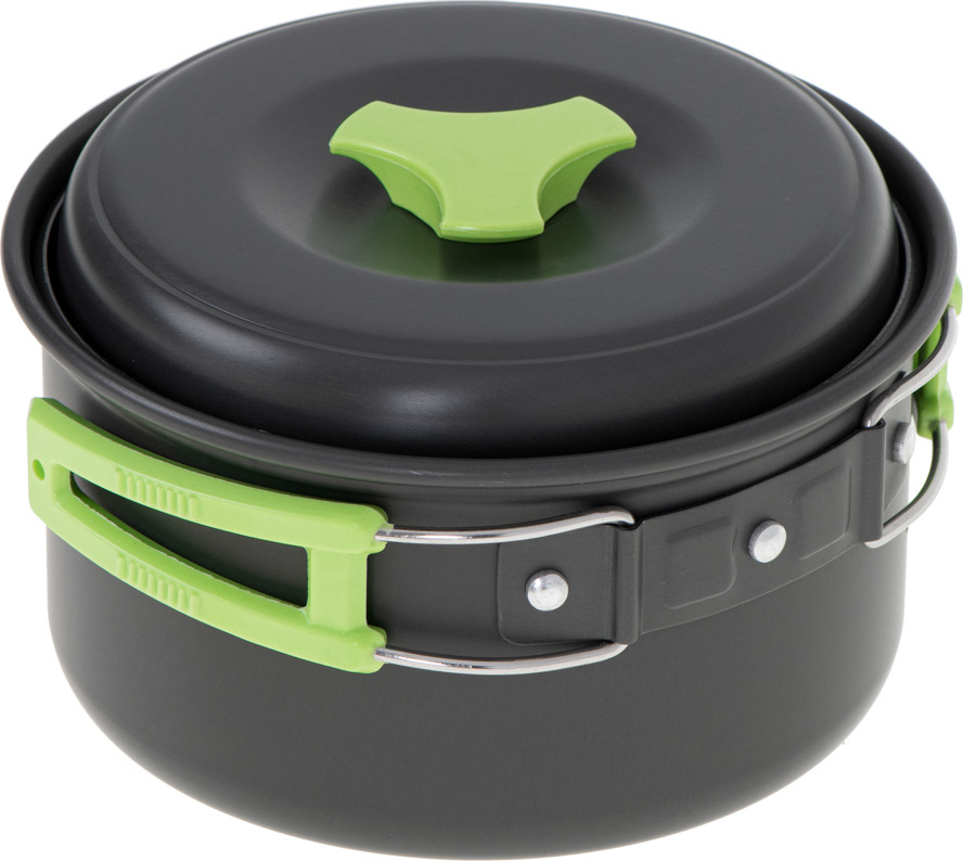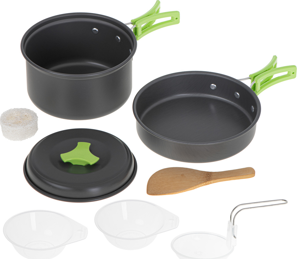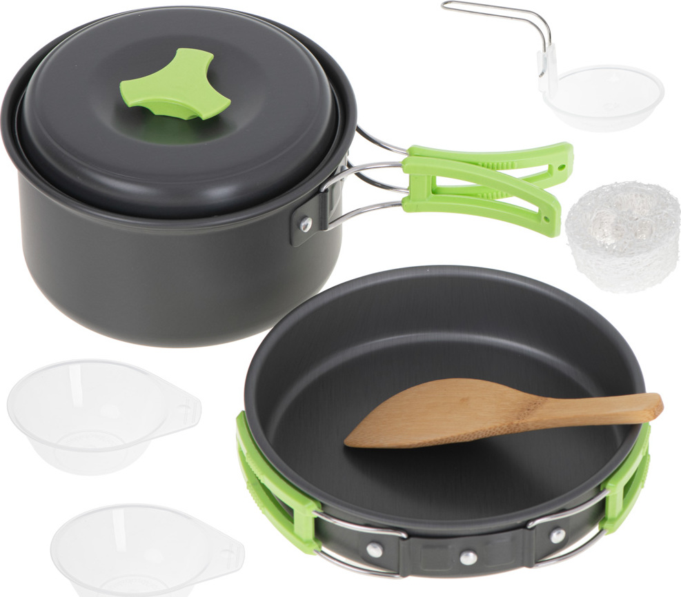 Tato sada kempingového nádobí se skládá z hrnce, pánve a mnoha dalších doplňků, které vám pomohou rychle a efektivně ohřát vodu nebo připravit lahodné jídlo venku. Sada obsahuje také dvě misky na sdílení připraveného jídla, dřevěnou špachtli na míchání a naběračku na servírování jídla. Po skončení jídla lze všechny položky sady pohodlně umýt pomocí přiložené utěrky – veškeré náčiní bude během chvilky připraveno na další vaření!