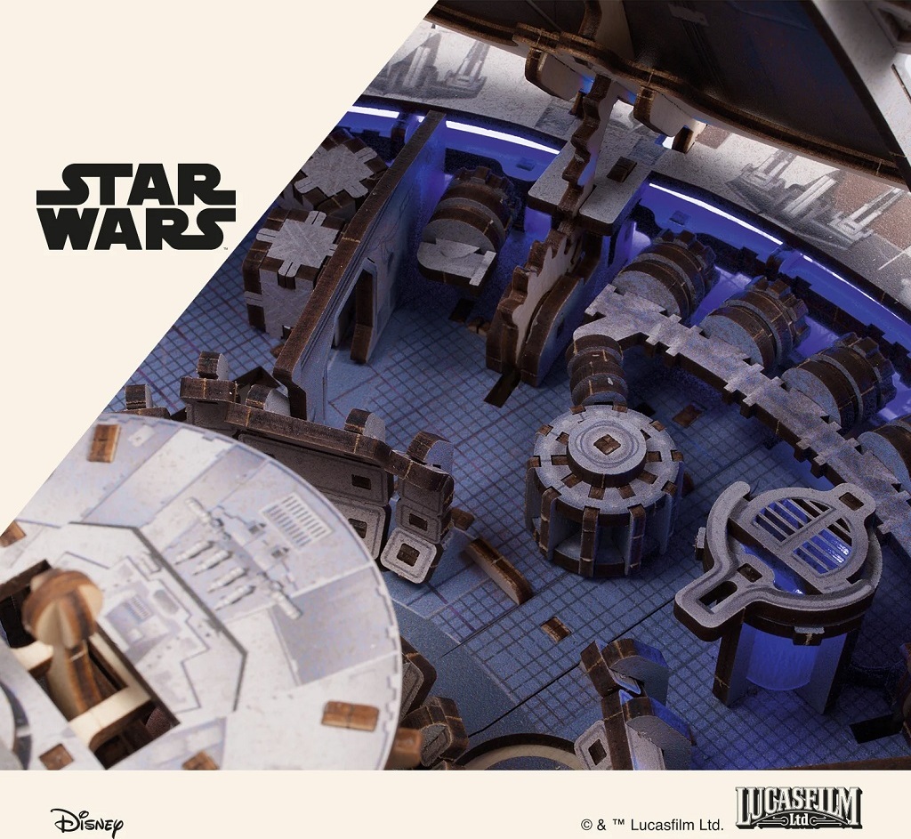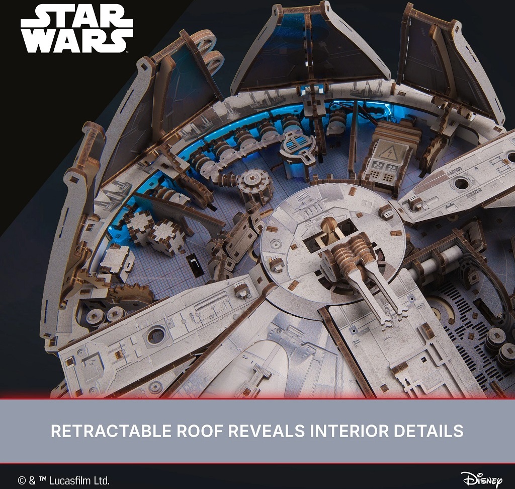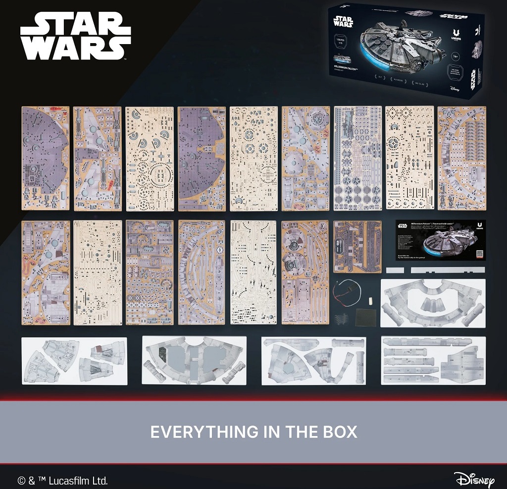 Postavte si legendární loď Millennium Falcon, ve které létal Han Solo a jeho posádka. Má modrá LED světla jako hyperpohon, otevírací střechu, nákladový prostor a rampu, pohyblivé dělostřelecké věže a anténu otočnou o 360°. Nechybí ani propracované detaily interiéru a exteriéru.Poskládejte a pilotujte nejrychlejší loď v galaxii! Proleťte Kessel Run za méně než dvanáct parseků s touto skládačkou z Ugears oficiální kolekce Star Wars.Model milované lodi Hana Sola a Chewbaccy v měřítku 1 : 75 je jedním z nejdetailnějších modelů. Millennium Falcon, klíčová stíhačka v nejzásadnějších bitvách proti Galaktickému impériu, prošla rukama řady zločinců, než byla nakonec ukradena a pilotována Rey ve filmu Síla se probouzí (2015), než ji Han a Chewie získali po tolika letech konečně zpět do svých rukou.Má detailní barevné prvky v interiéru i exteriéru, vypadá jako opravdová loď, kterou znají všichni fanoušci z filmů Star Wars. Hyperpohon simulují modrá LED světla, které jsou napájená bateriemi, ty však nejsou součástí balení.Mezi pohyblivé prvky patří dveře nákladového prostoru, rampa, podvozek, dělostřelecké věže, anténa otočná o 360° a zatahovací střecha, která se otevírá na části a umožňuje zobrazit opravdu detailní a realistický interiér lodi. Dřevovláknitá deska s vysokou hustotou a karton dodávají lodi větší odolnost a zajímavý vzhled. Postavte si kus filmové historie, postavte si impozantní 3D model lodi Millennium Falcon.