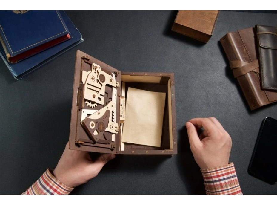 Knihy byly používány k ukrývání předmětů téměř tak dlouho, co existují. Do knihy vyhloubíte otvor, schováte svou cennost a knihu uložíte na polici mezi další svazky a nikdo kromě Vás nepozná, že je něčím vyjímečná. Stavebnice knihy, která je zároveň skrýší na tajnosti, je vyrobena z překližky. Po sestavení se kniha promění ve funkční schránku, do které můžete vložit své poklady nebo vzkaz pro někoho blízkého, protože tato zdobená kniha může být i netradičním a zábavným dárkem a bude se báječně vyjímat na polici. Kombinace přírodního a tmavého dřeva spolu s originálními a funkčními pohyblivými detaily jako jsou ozubená kola na přední straně nebo číselník na hřbetu knihy přispěje k nezapomenutelnému zážitku při sestavování. Knihu otevřete pomocí třímístného kódu na hřbetu knihy a otočením klíče a ozubených koleček anebo i bez toho, že byste věděli číselnou kombinaci. Puzzle je vybaveno detailním návodem k sestavení, a to bez použití lepidla.