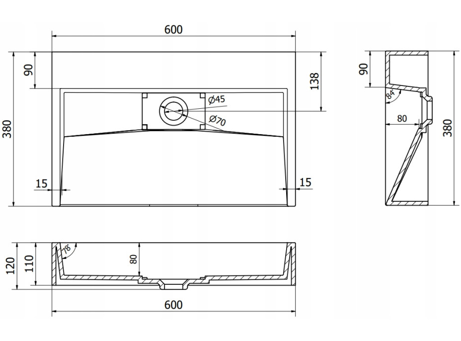 - Rozměry umyvadla: 600 x 380 x 120 mm
