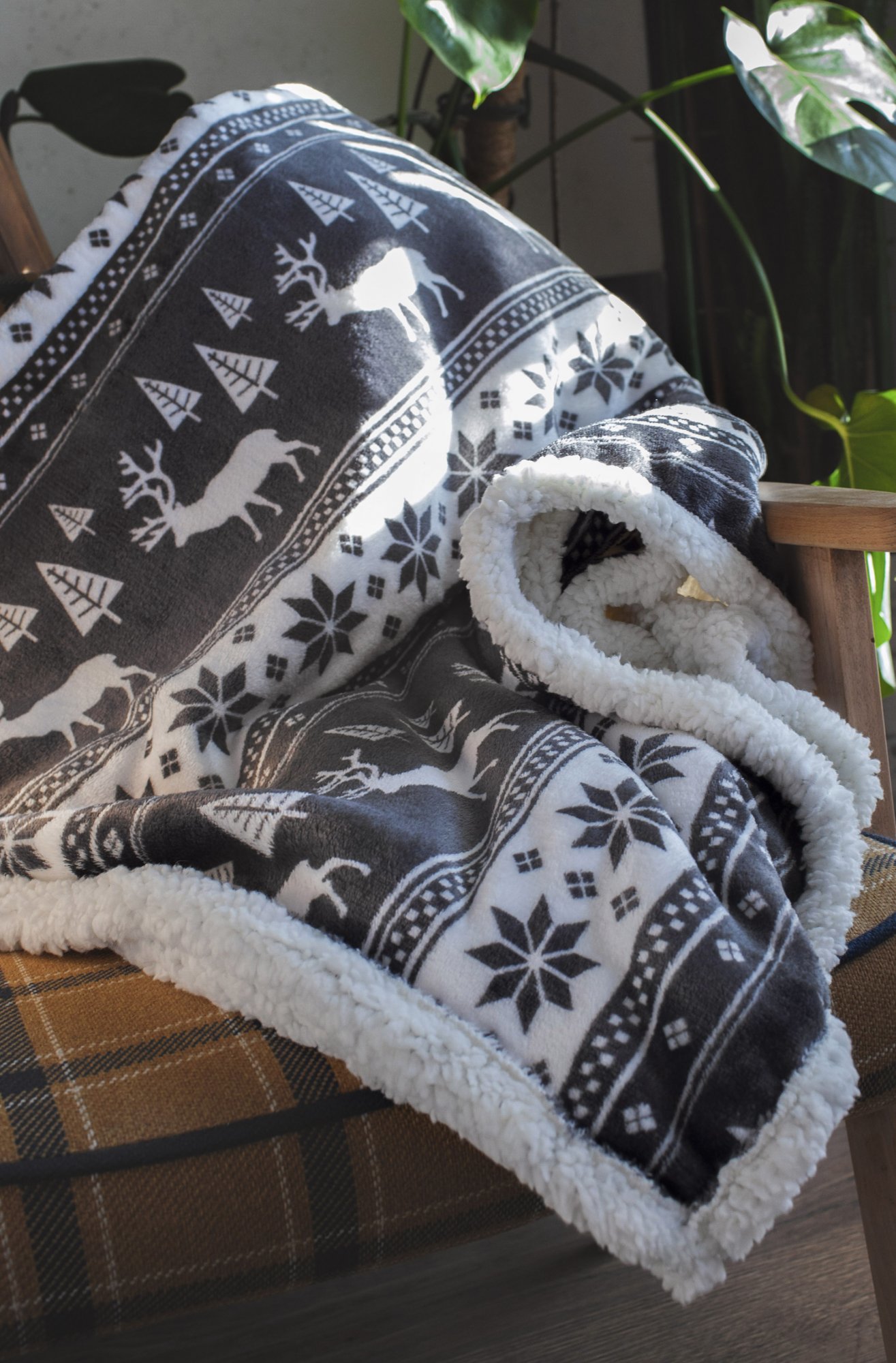 Vánoční deka z kolekce Saco je skvělým nápadem na dárek a ideální pro zdobení vašeho domova během zimního a vánočního období. Deka je vyrobena z polyesterové tkaniny, která se snadno čistí. Tento materiál je měkký, teplý a praktický. Deka má zvenku sváteční skandinávský vzor a zevnitř je podšitá jednobarevnou bílou šerpa látkou, která je hřejivá jako vlna. Tato jemná látka se vyznačuje hypoalergenním složením. Celá sada je zabalena ve stylovém sáčku, který ladí s dekou barvou i vzorem. Tato sada je ideálním dárkem.