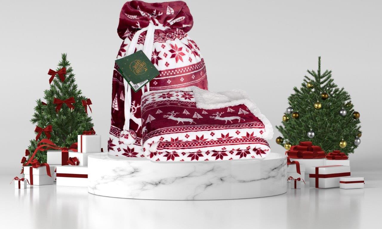 Vánoční deka z kolekce Saco je skvělým nápadem na dárek a ideální pro zdobení vašeho domova během zimního a vánočního období. Deka je vyrobena z polyesterové tkaniny, která se snadno čistí. Tento materiál je měkký, teplý a praktický. Deka má zvenku sváteční skandinávský vzor a zevnitř je podšitá jednobarevnou bílou šerpa látkou, která je hřejivá jako vlna. Tato jemná látka se vyznačuje hypoalergenním složením. Celá sada je zabalena ve stylovém sáčku, který ladí s dekou barvou i vzorem. Tato sada je ideálním dárkem.