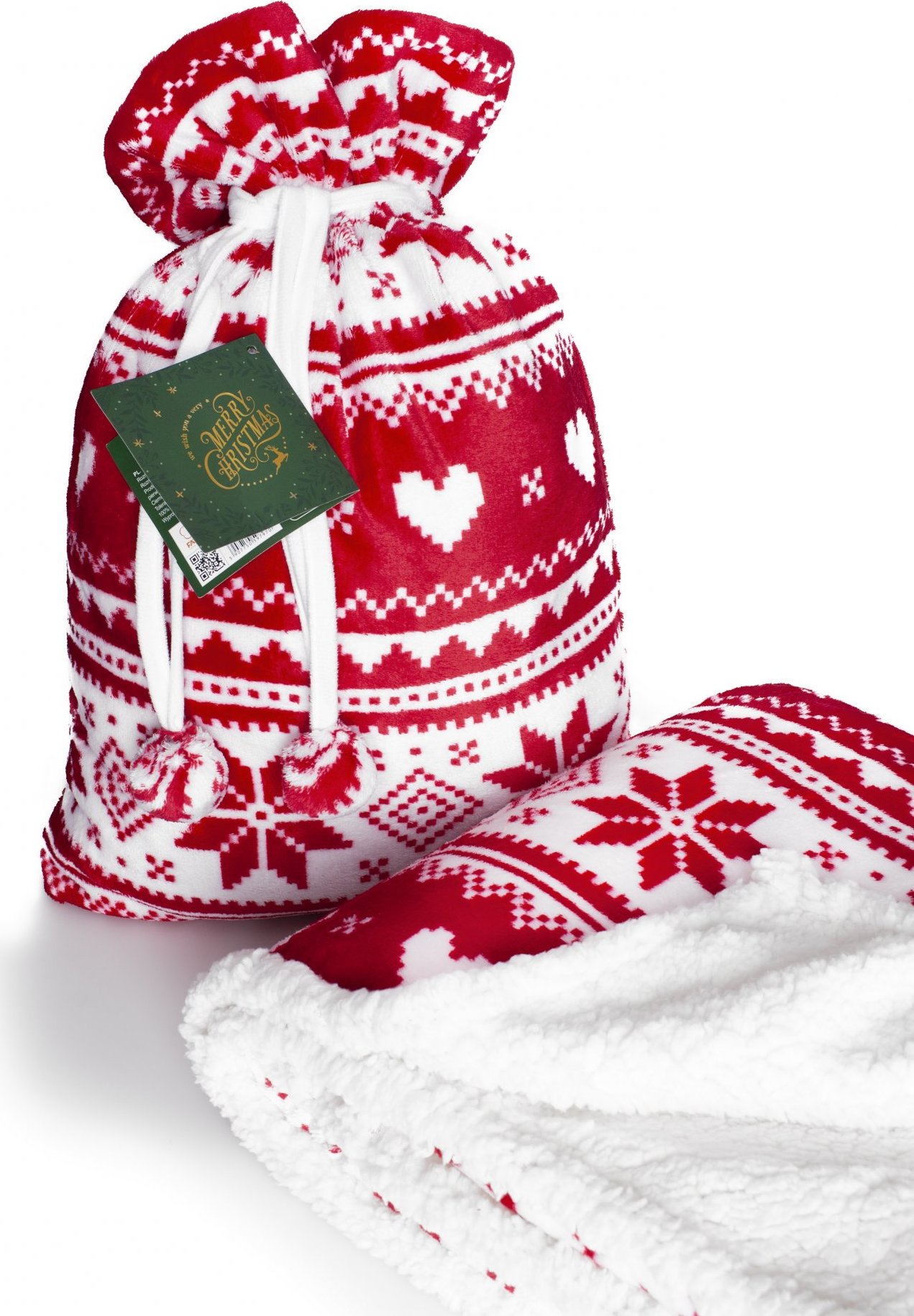 Vánoční deka z kolekce Saco je skvělým nápadem na dárek a ideální pro zdobení vašeho domova během zimního a vánočního období. Deka je vyrobena z polyesterové tkaniny, která se snadno čistí. Tento materiál je měkký, teplý a praktický. Deka má zvenku sváteční skandinávský vzor a zevnitř je podšitá jednobarevnou bílou šerpa látkou, která je hřejivá jako vlna. Tato jemná látka se vyznačuje hypoalergenním složením. Celá sada je zabalena ve stylovém sáčku, který ladí s dekou barvou i vzorem. Tato sada je ideálním dárkem.