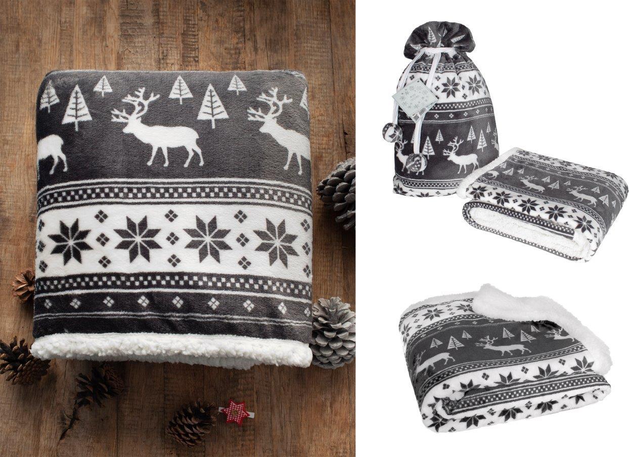 Vánoční deka z kolekce Saco je skvělým nápadem na dárek a ideální pro zdobení vašeho domova během zimního a vánočního období. Deka je vyrobena z polyesterové tkaniny, která se snadno čistí. Tento materiál je měkký, teplý a praktický. Deka má zvenku sváteční skandinávský vzor a zevnitř je podšitá jednobarevnou bílou šerpa látkou, která je hřejivá jako vlna. Tato jemná látka se vyznačuje hypoalergenním složením. Celá sada je zabalena ve stylovém sáčku, který ladí s dekou barvou i vzorem. Tato sada je ideálním dárkem.