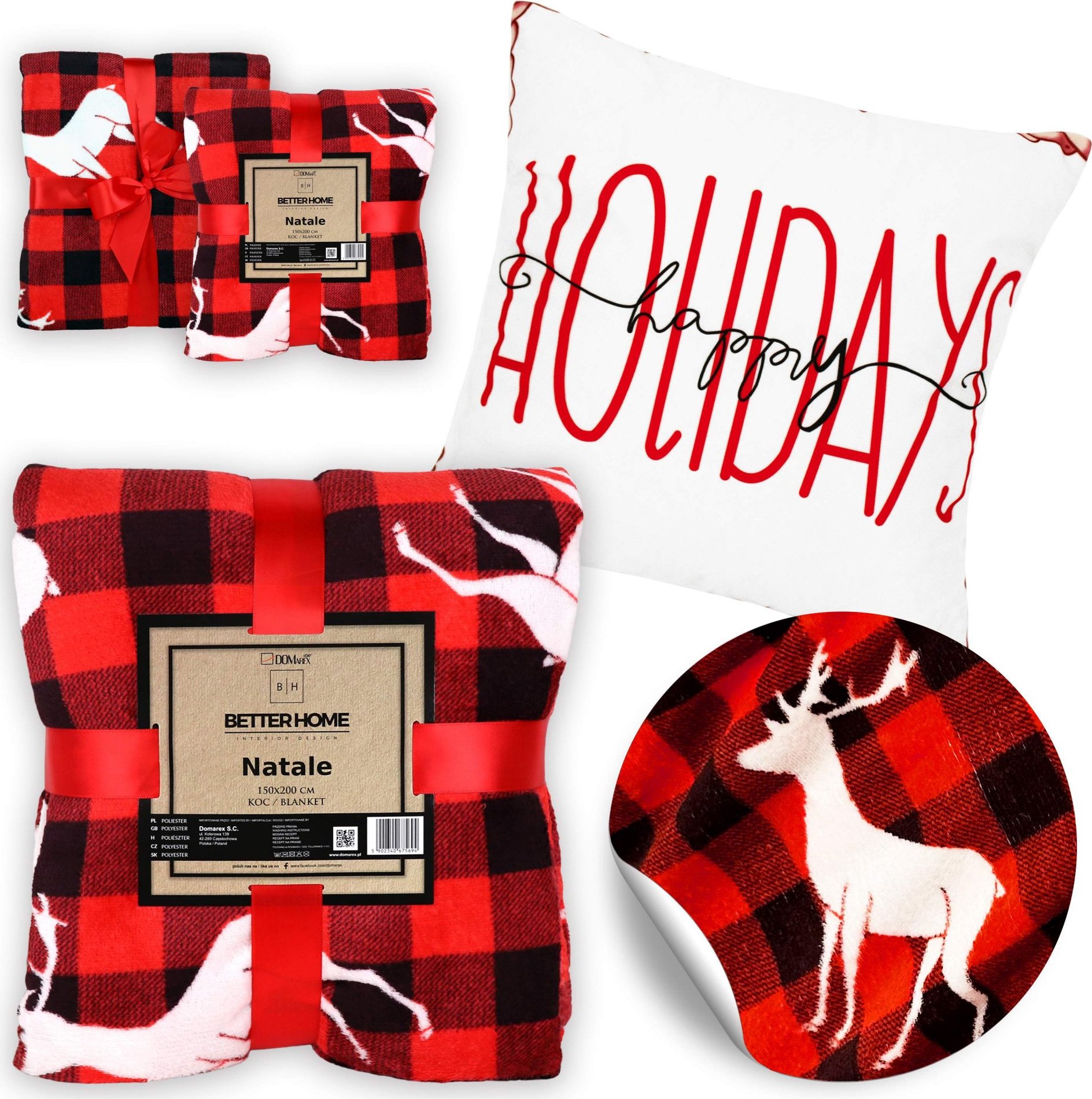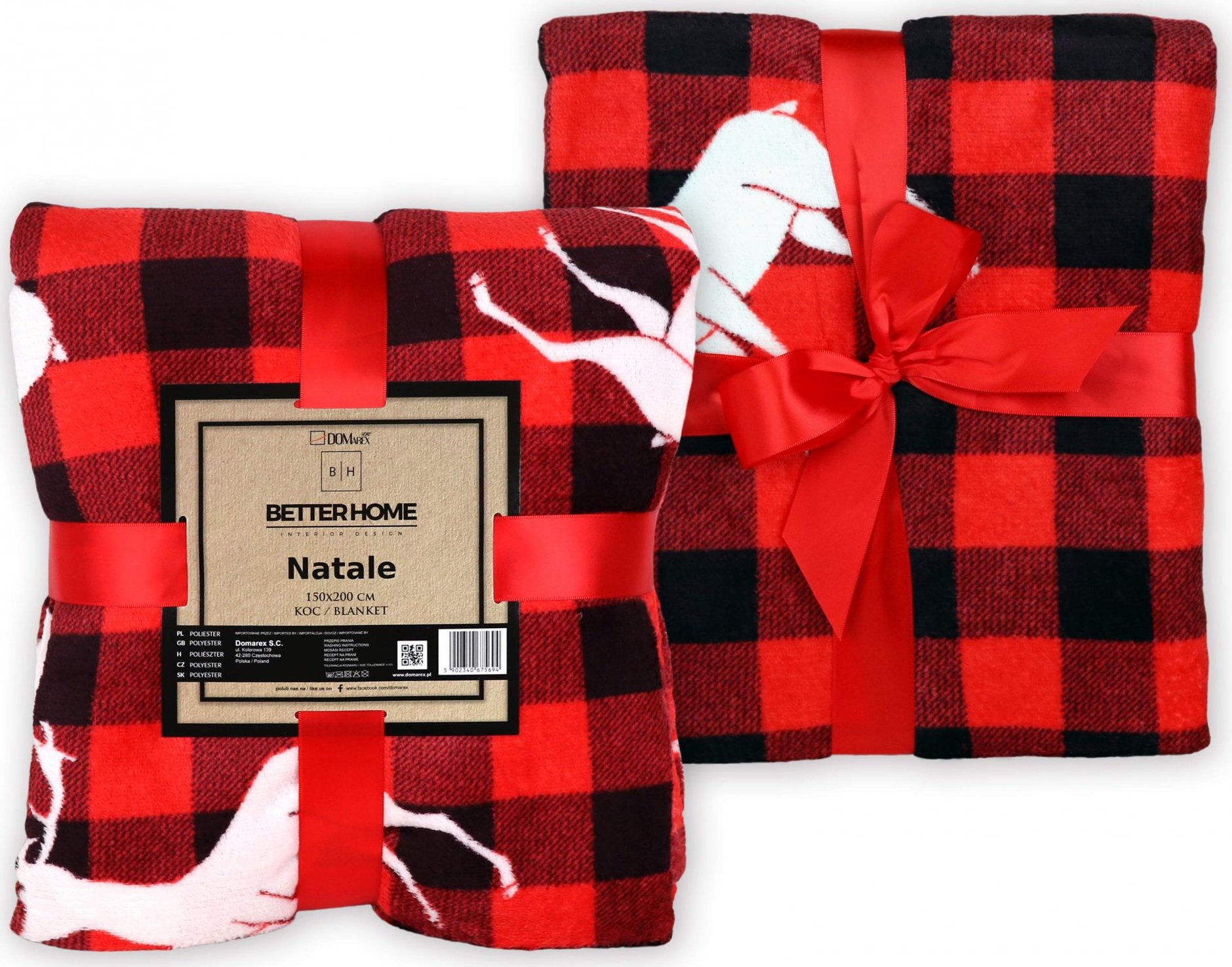 - Deka NATALE 150x200 cm – Tato deka s červeno-černým kostkovaným vzorem a motivem bílého soba se bude hodit k tradiční vánoční atmosféře, které dominuje teplá červená barva. Ideální pro zachumlání v chladných dnech nebo pro přikrytí postele, pohovky či křesla.