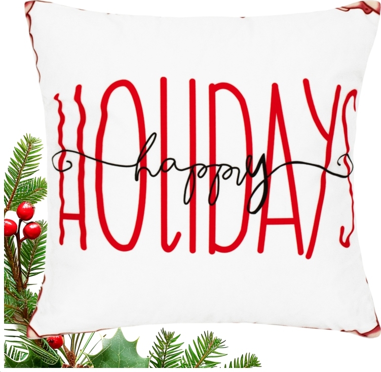 - Polštář „Happy Holidays“ 40x40 cm – Tento bílý polštář s červeným nápisem „Happy Holidays“ umocní sváteční atmosféru a podpoří odpočinek a relaxaci.