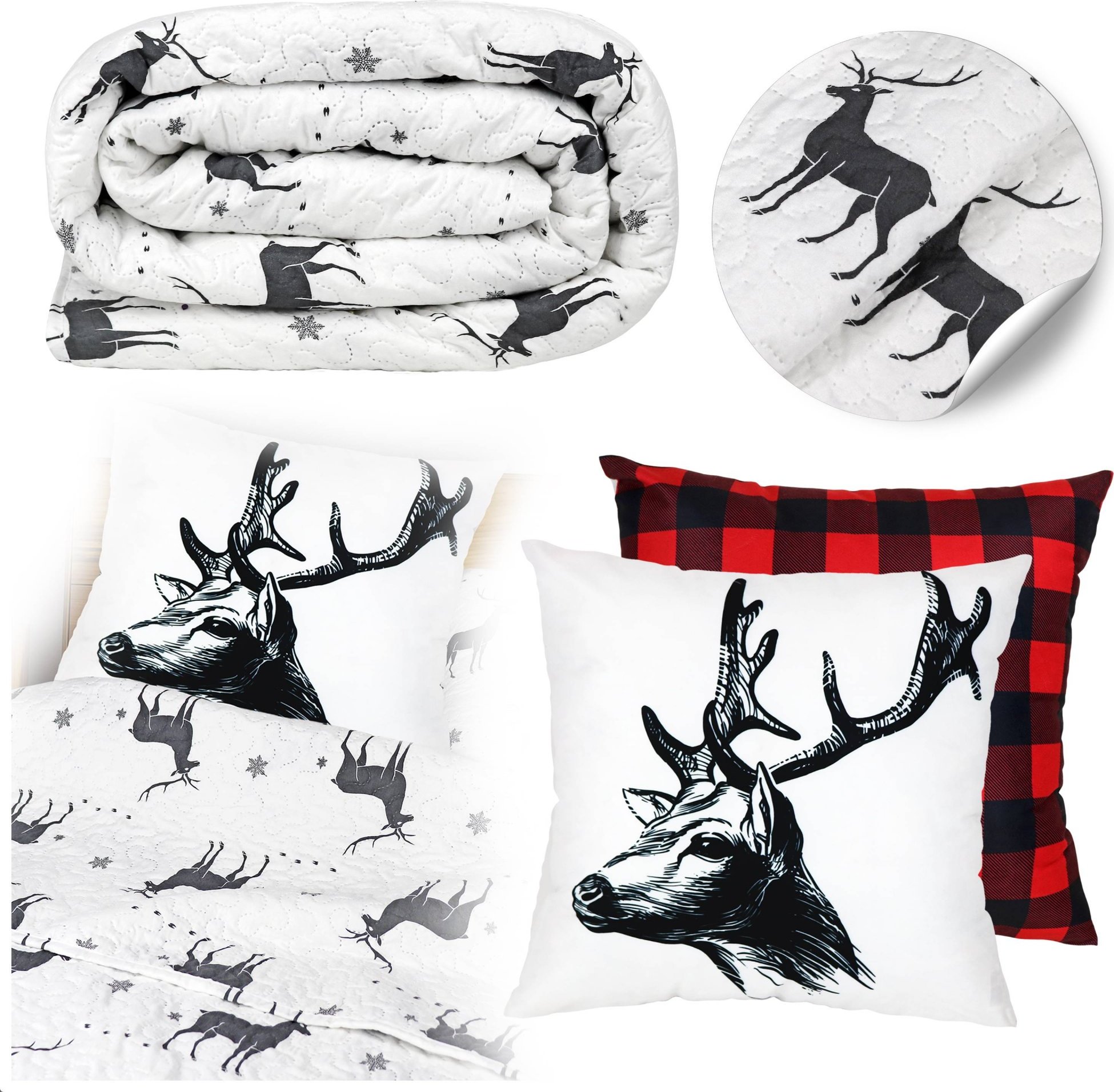 - MERRY Oboustrannoý přehoz 150x200 cm – elegantní bílý přehoz s jemným grafitovým vzorem sobů, který dokonale doplní zimní a sváteční atmosféru. Oboustranná látka vám umožní snadno měnit vzhled vaší ložnice v závislosti na vaší náladě – sobi na jedné straně dominují bílému pozadí, zatímco druhá strana je zdobena klidnými geometrickými vzory. Přehoz má rozměry 150x200 cm, takže je ideální volbou do postele a zajišťuje jak estetickou přitažlivost, tak i pohodlí.